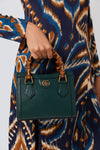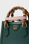 Inspired by Princess Diana’s iconic style, this modernized GUCCI Dark Green Bamboo Diana 2 Way Handbag blends elegance with a bold twist. Featuring bamboo handles and the signature gold GG logo, it's both timeless and glamorous. The removable pink leather belt adds a chic nod to its '90s heritage. A true statement piece for those who appreciate classic sophistication with a contemporary edge.