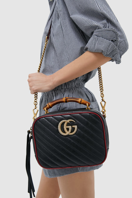 The Gucci Quilted Marmont Bamboo Handle Camera Bag is where classic quilting meets an iconic bamboo twist. Compact yet statement-making, it’s finished with antique gold hardware and the signature GG logo—perfect for brunch dates, gallery hopping, or just elevating your daily uniform. Sling it crossbody or carry it by the top handle for an instant style upgrade.