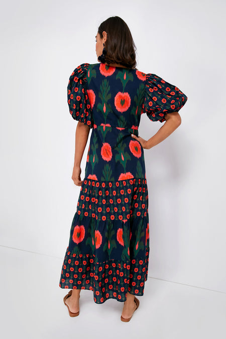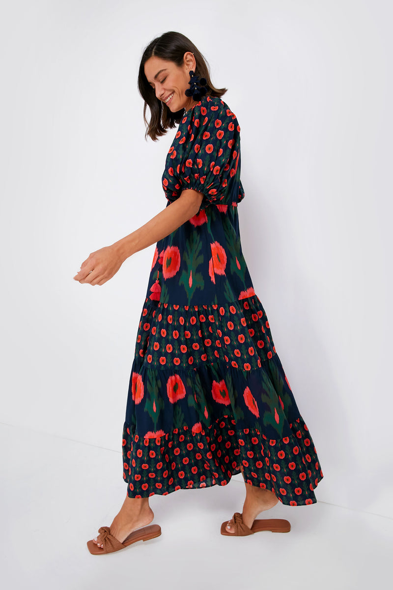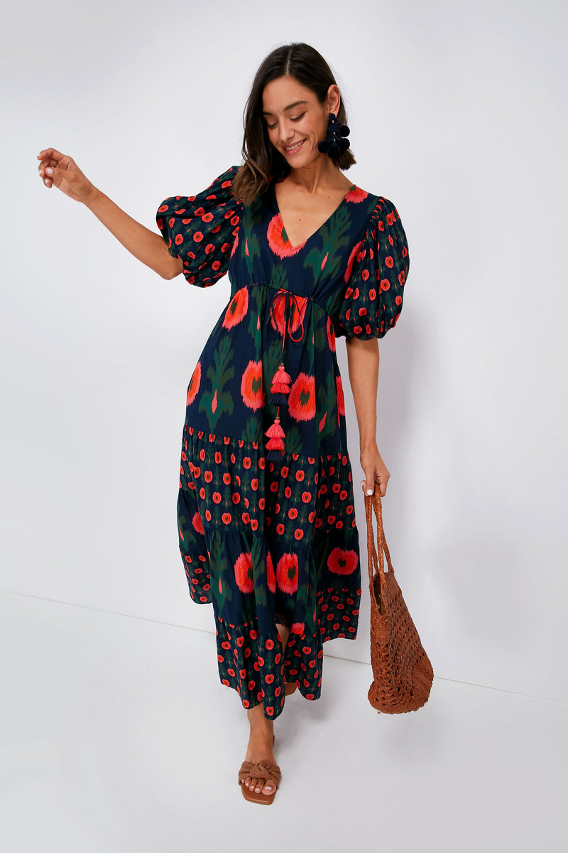 Printed with poppies, the Hanging Flower Midnight Navy Vilette Dress is full of vibrant shades and bohemian-inspired details. With elegant elbow-length puff sleeves, a drawstring waist with tassel ties, and a tiered skirt that is begging to be twirled, this maxi packs a punch while being effortlessly fresh and feminine. Pair with sandals and a tote for an elevated everyday look, or style with wedges and statement earrings for warm evenings spent watching the sunset.