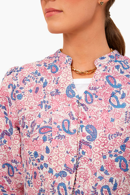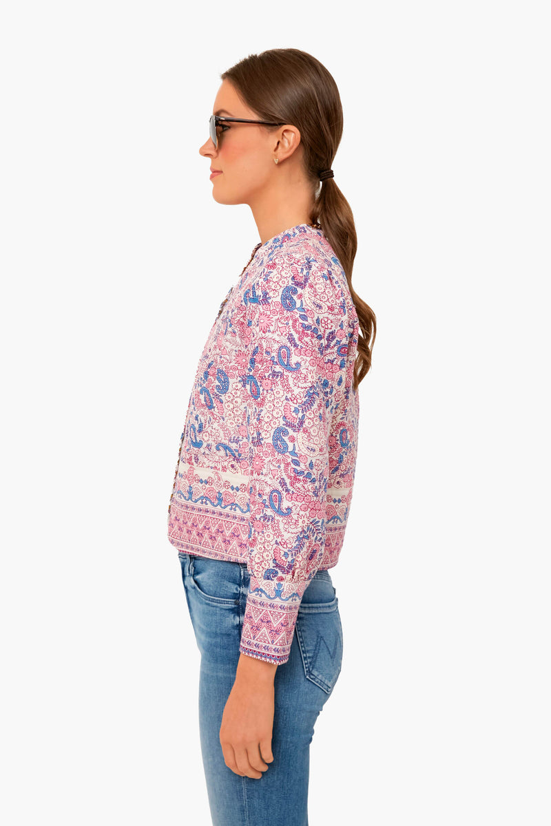 Make a statement in the Helene Jacket. Made from Batik-printed cotton voile in pink and blue tones and quilted in a Boutis style, this coat is a fun and unique piece. Throw over jeans and a tee for a fresh, cool-girl spring look.