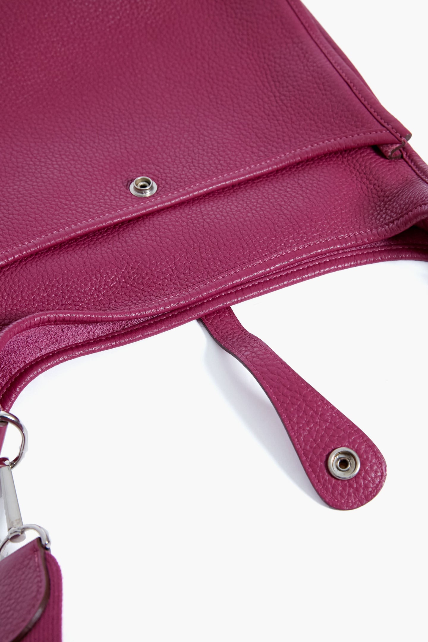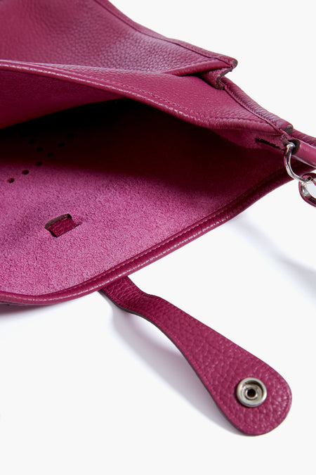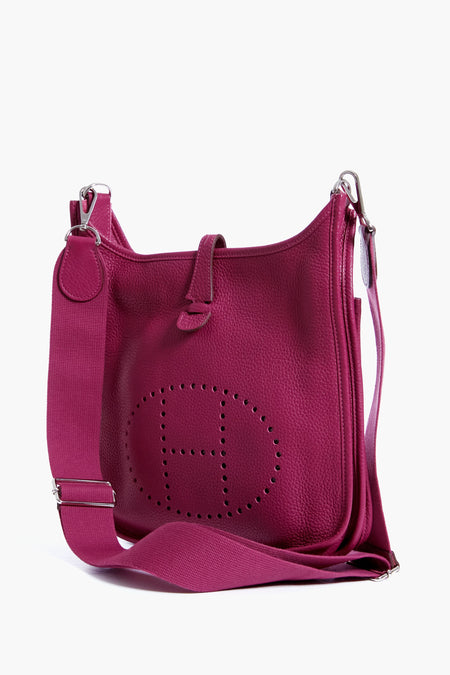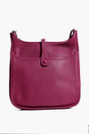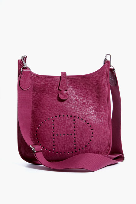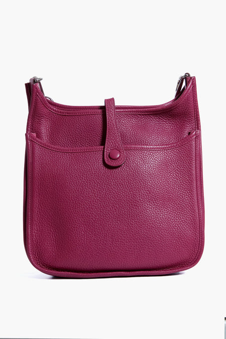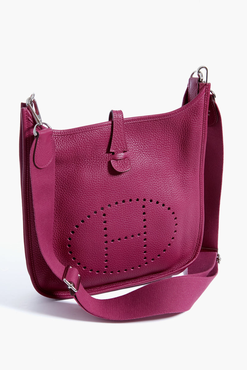 Designer fashion meets function with the Hermes Purple Clemence Evelyn III PM. Designed in 1978 by Evelyne Bertrard, head of the brand’s riding department, it was originally constructed to carry horse grooming tools. Once the brand allowed the bag to be sold to the public and not solely for the equestrian department’s use, the silhouette has only grown in popularity. The iconic perforated H logo is contrasted against a unique, rich maroon pebbled leather with a button closure and an adjustable shoulder strap. This classic crossbody is for the girl-on-the-go who wants something simple and chic, withstanding the wear and tear of everyday life.