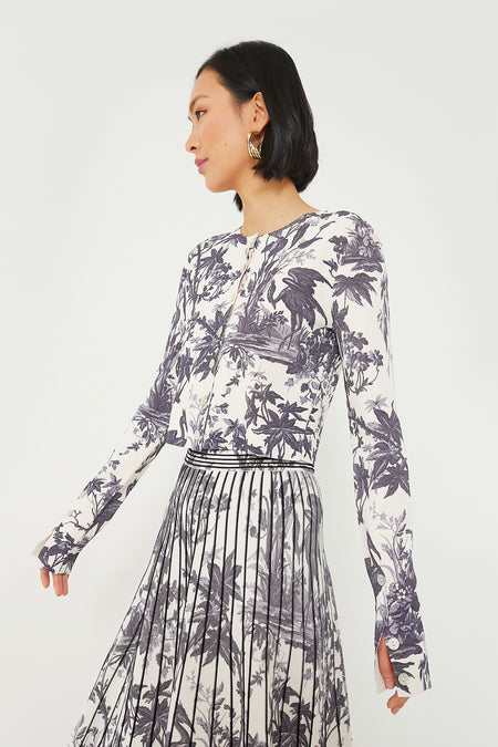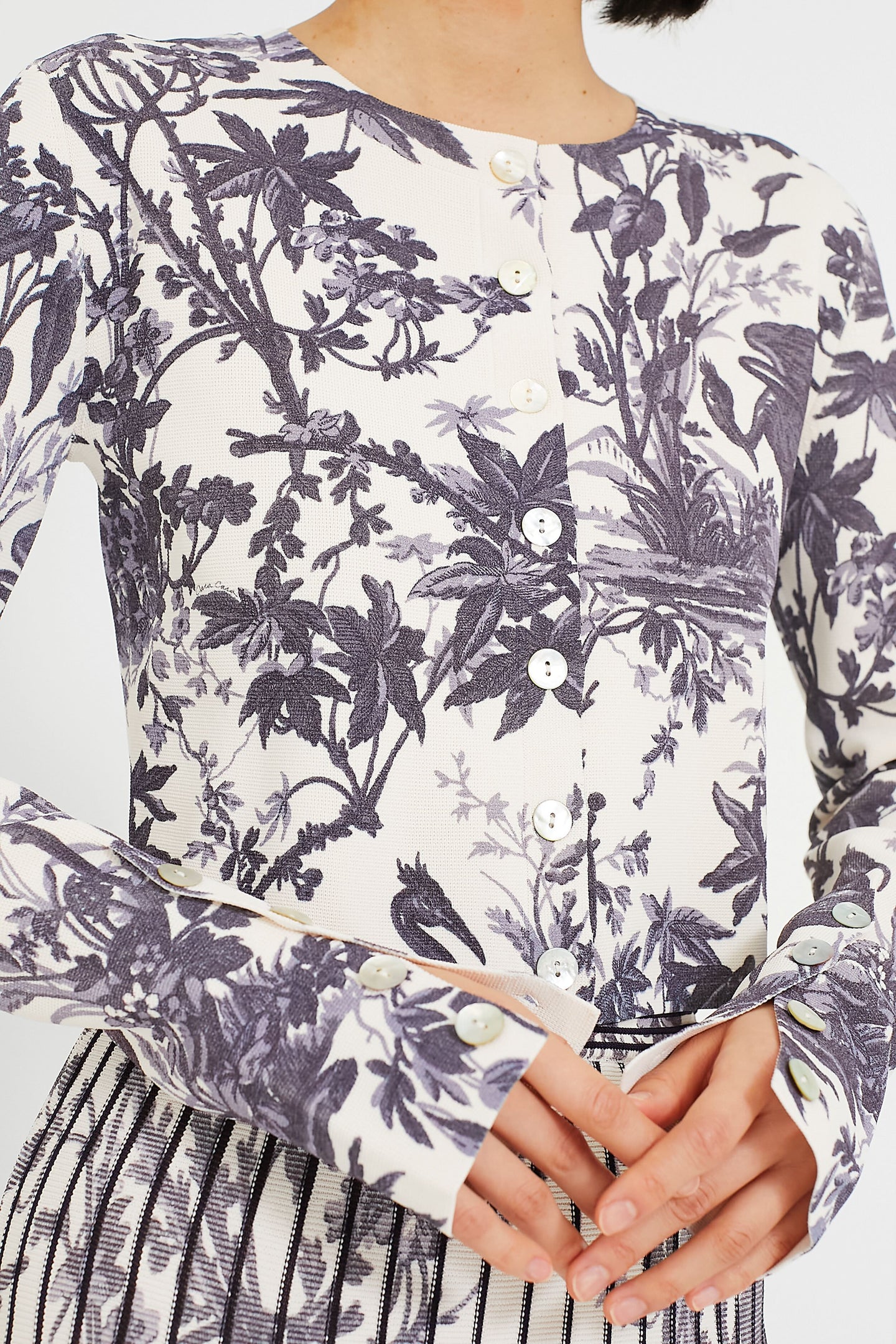 The Heron Evening Blue Amber Cardigan is like a breath of fresh air for your wardrobe! Boasting bold floral print and rendered in slick Milano knit, this flattering top’s slightly cropped silhouette with functional shell buttons on front placket and sleeves offer day to night versatility for every occasion. We are pairing with the matching skirt for a full-fledged set moment or with on-trend flare pants and sandals for the ultimate cool-girl look.