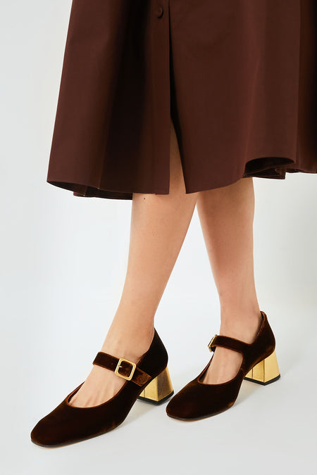 The Honey and Gold Velvet Mid Mary Janes are not just footwear, they're a fashion statement! Promising an effortlessly stylish look, these are crafted from soft velvet with a contrasting gold heel and a buckle, evoking a sense of vintage glamour. Pair with a blazer and a crisp button-down for the office, with a chic dress for a dinner party, or with denim and a blouse for date night.