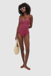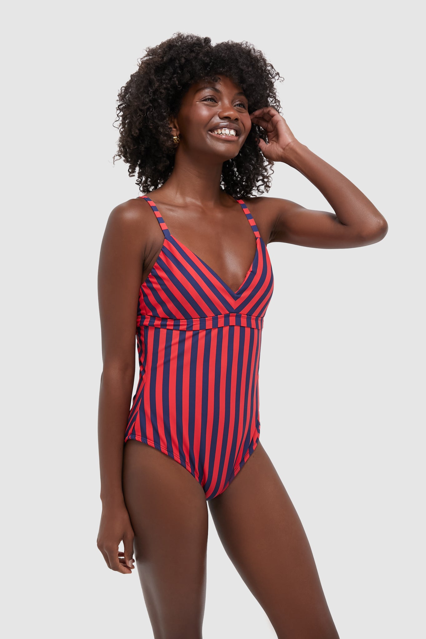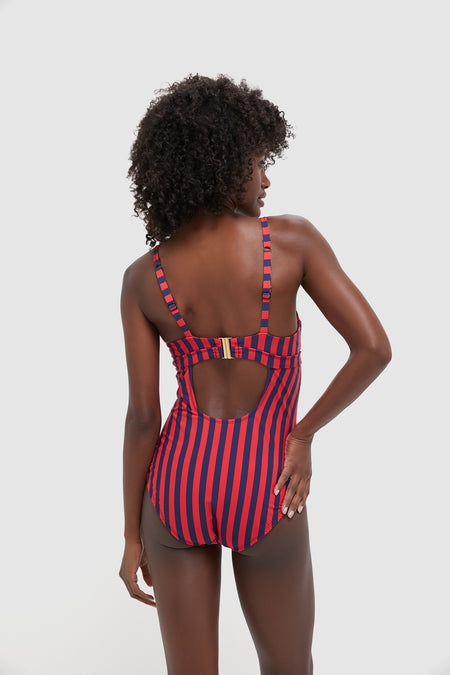 The Hot Pepper and Navy Striped Dreamsculpt One Piece swimsuit doesn't sacrifice sexy! Cut in sculpting and cooling fabric, this one piece shows just the right amount of skin - in all the right places. Featuring a V-neckline, open back design, finished with a chic gold clasp. Just add your favorite coverup, sunnies, and beach bag for all day fun!