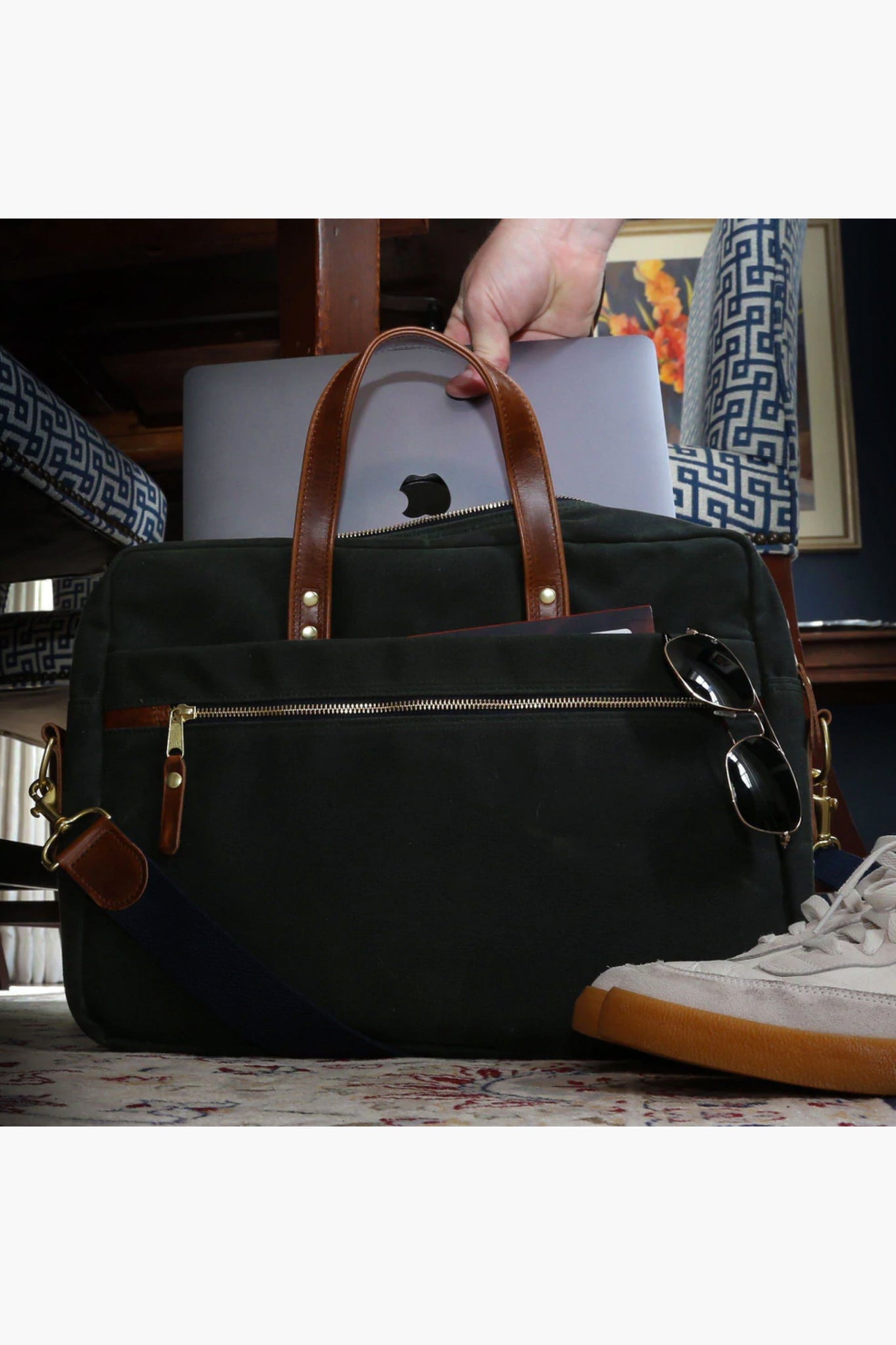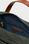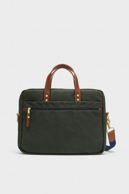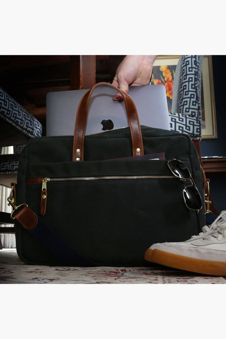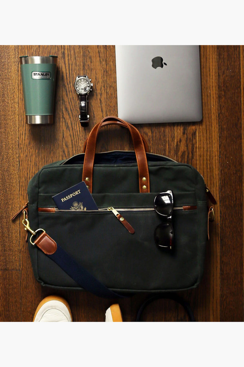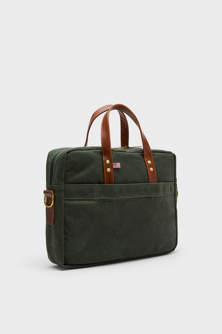 Classic looks and American handcrafted quality, the Heritage Brief Case is made to carry your office essentials. Rugged design with a padded laptop sleeve, spill resistant liner, full grain leather trim, brass hardware and cotton shoulder strap keep you looking sharp. Finished with an integrated rolling luggage loop for swift maneuvering to your departure gate, you can travel with ease and style!