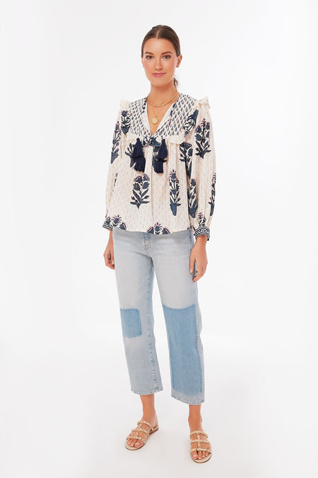 Step up your look with a bit of bohemian flair in the Indigo and Violet Palladio Garden Clover Top. This relaxed and easy silhouette is made of airy cotton lurex that feels fabulous and looks even better, while stand out tassel ties and a contrasting pattern at the ruffle-trimmed bib bring out the best in this style. Perfect as a throw-on-and-go piece that makes a statement without being over the top, we love how this looks with light-wash or white denim and chic sandals for days spent enjoying the sunshine.