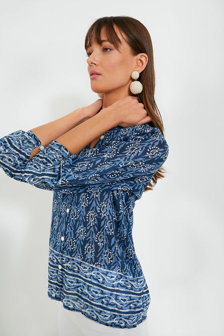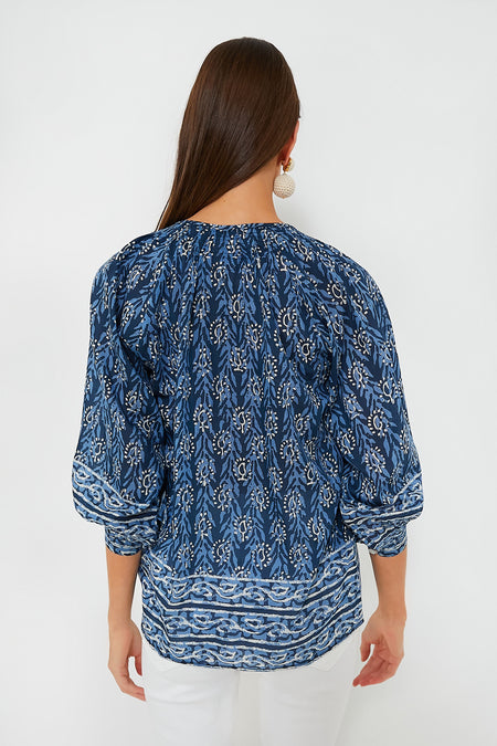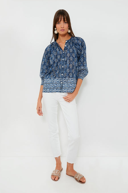 The Indigo Courtney Top is a fenimine blouse that is a perfect all-occasion top. With a front button placket, blue patterned fabric, and three-quarter length blouson sleeves, this top is equal parts traditional and modern. Pair with denim and white sneakers or ballet flats for a polished everyday outfit.
