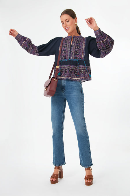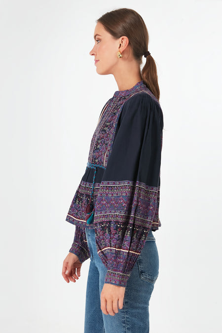 The Iris Adella Print Long Sleeve Top is a boho-chic dream in a cool-toned color palette that will transition fabulously into colder weather. This blouse features a just-barely cropped length intended to hit at the top of your favorite high-waisted jeans, as well as dramatic balloon sleeves and braided tassel tie accents that add a hint of detail. We love to wear these with slightly flared denim for a retro-inspired look that will turn heads.