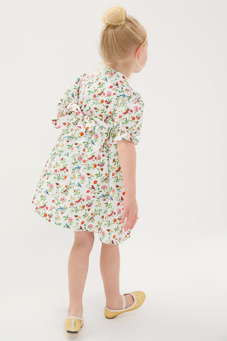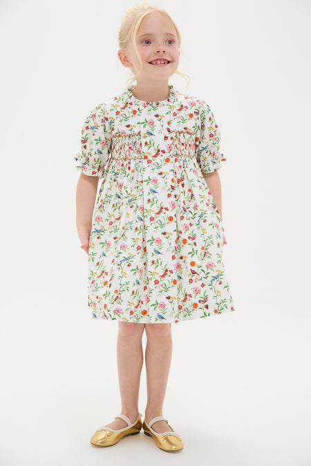 The Ivory Bird Floral Carla Hand-Smocked Girls Dress is a delightful choice for the warm-weather season. With a charming stand collar, pleated trim, and shirred bodice, this dress exudes total elegance. Short puffed sleeves add a voluminous touch, while the longer-length floaty skirt is fully lined for comfort and finished with a self-tie bow at the back. From school events, family functions, and everything in between, this is a dress your little one is sure to love!