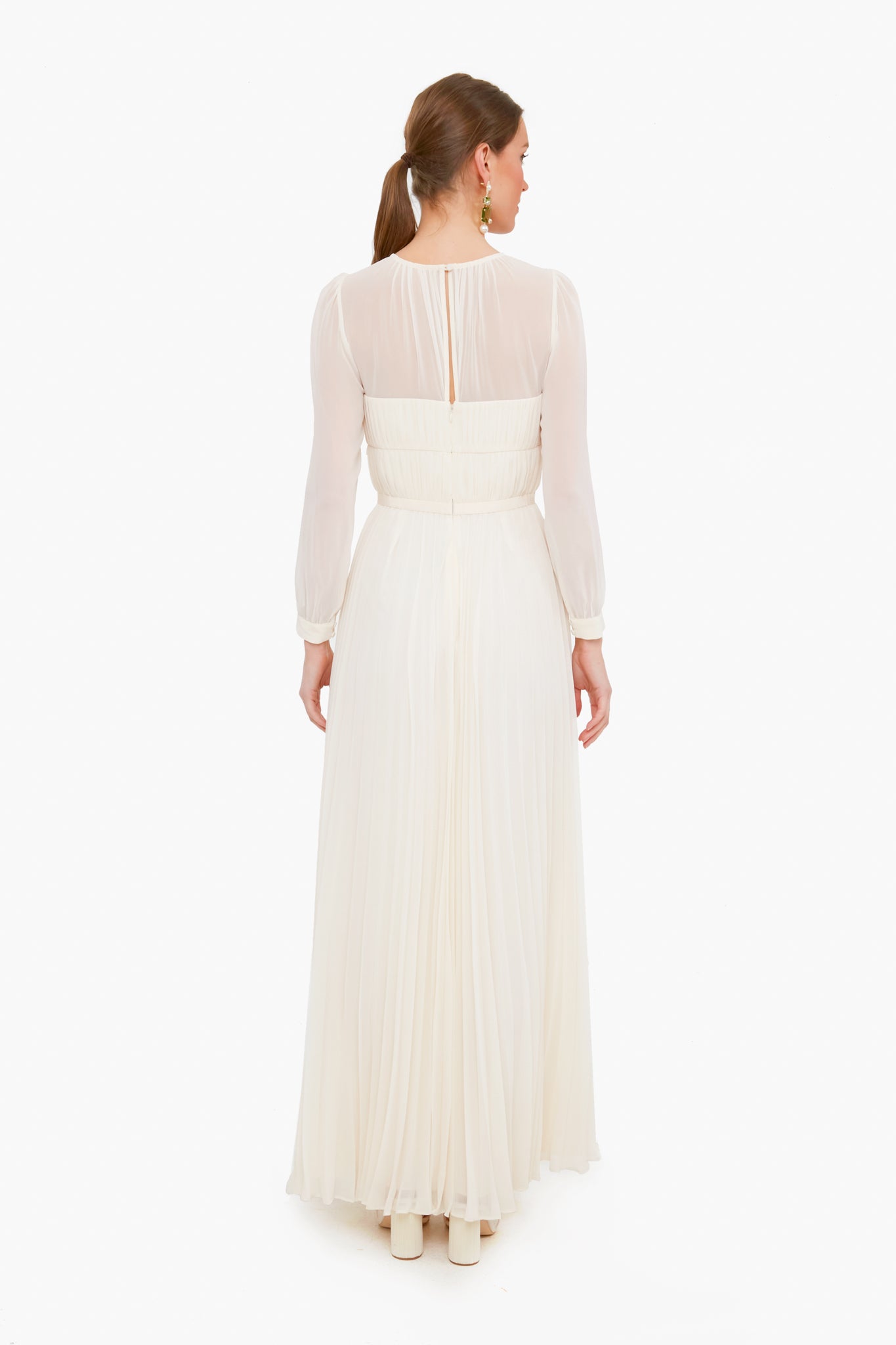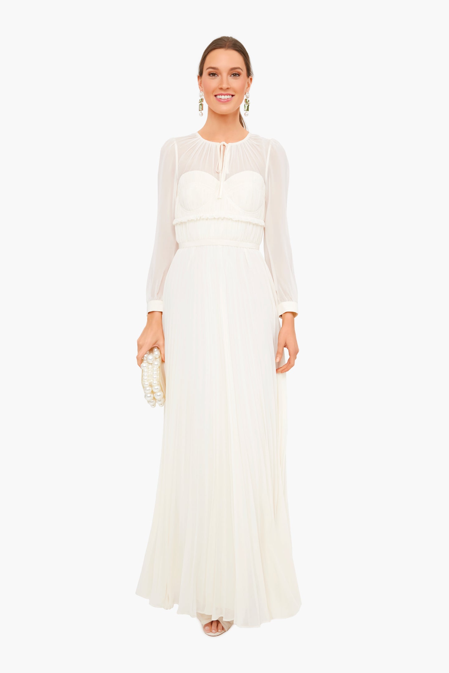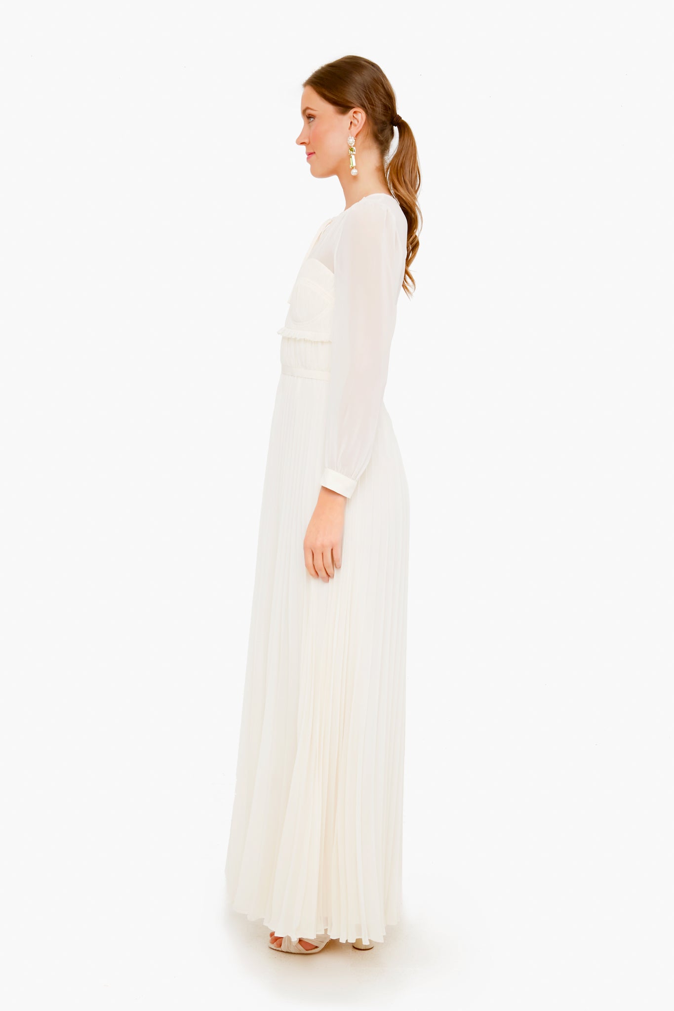 This elegant dress is cut from fluid recycled chiffon. It is designed with a tie at the neck and features a pleated bust detail with a fitted waist. The pleated skirt falls to a full maxi length for a graceful and romantic look. Perfect for the bride- you are sure to shine throughout your wedding festivities!