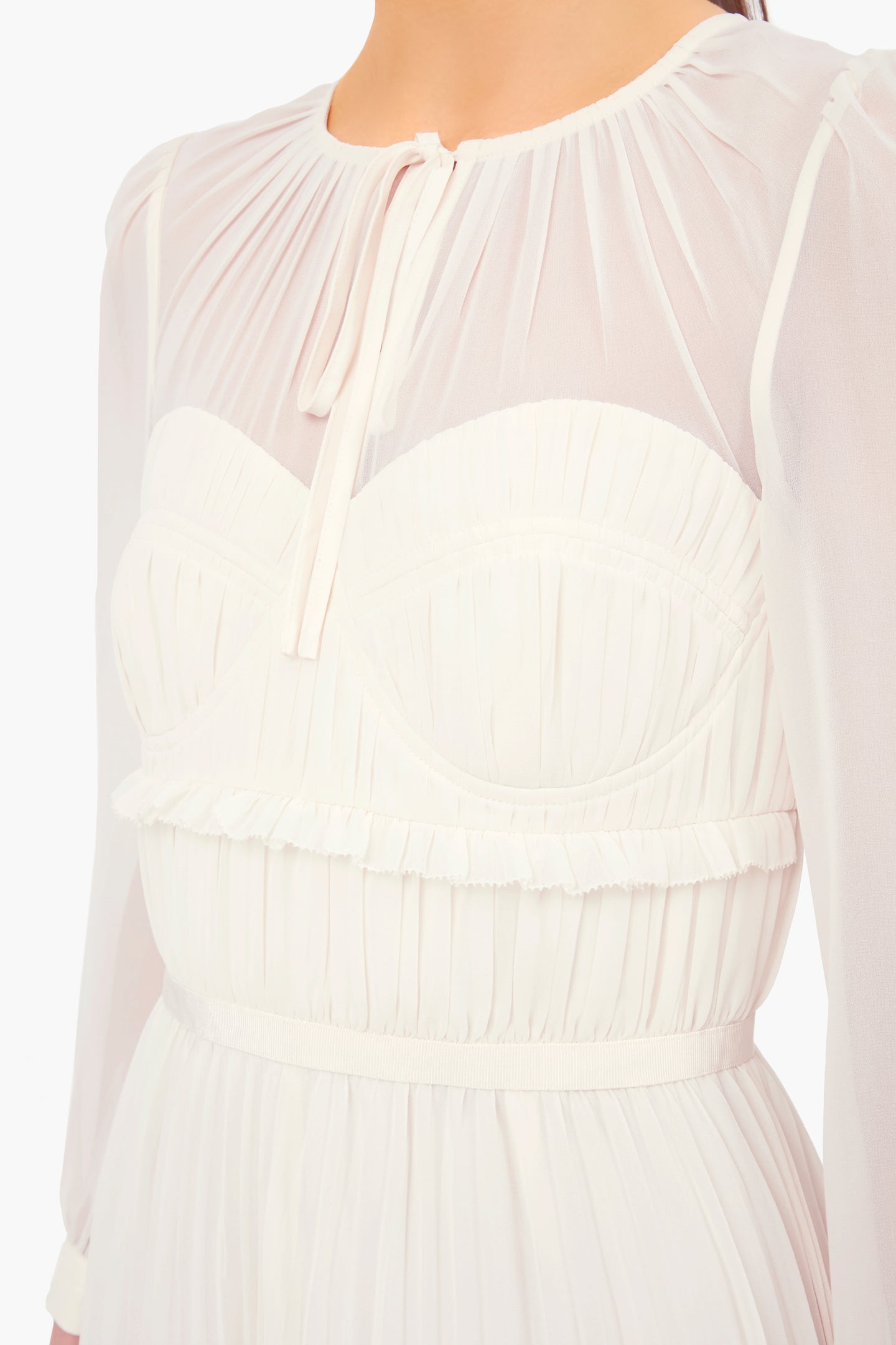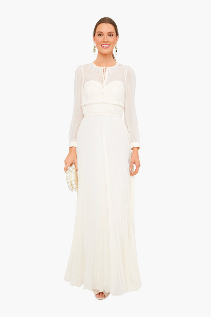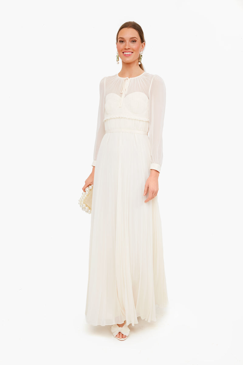 This elegant dress is cut from fluid recycled chiffon. It is designed with a tie at the neck and features a pleated bust detail with a fitted waist. The pleated skirt falls to a full maxi length for a graceful and romantic look. Perfect for the bride- you are sure to shine throughout your wedding festivities!