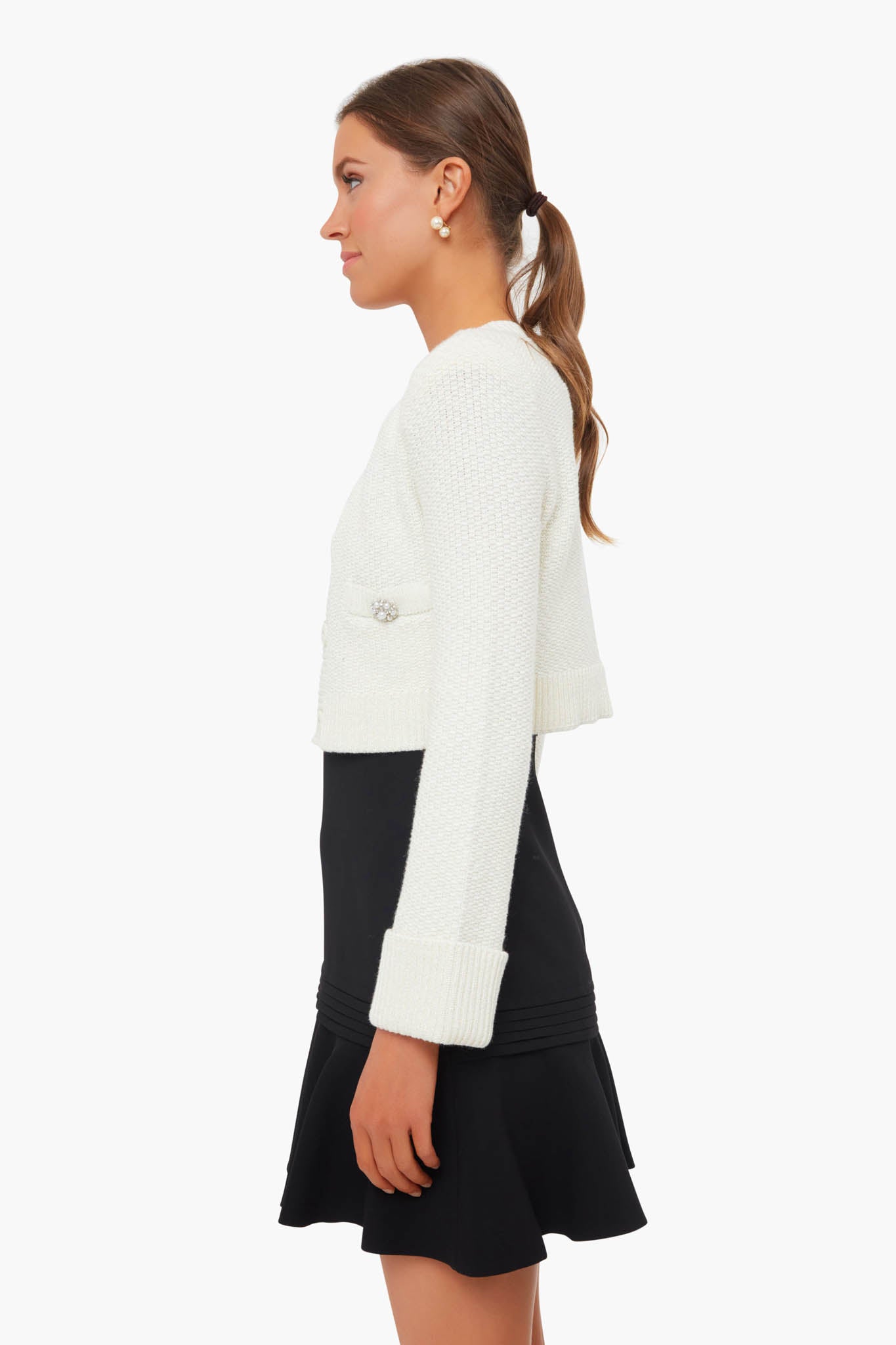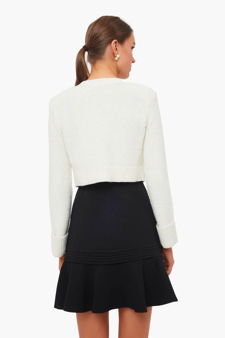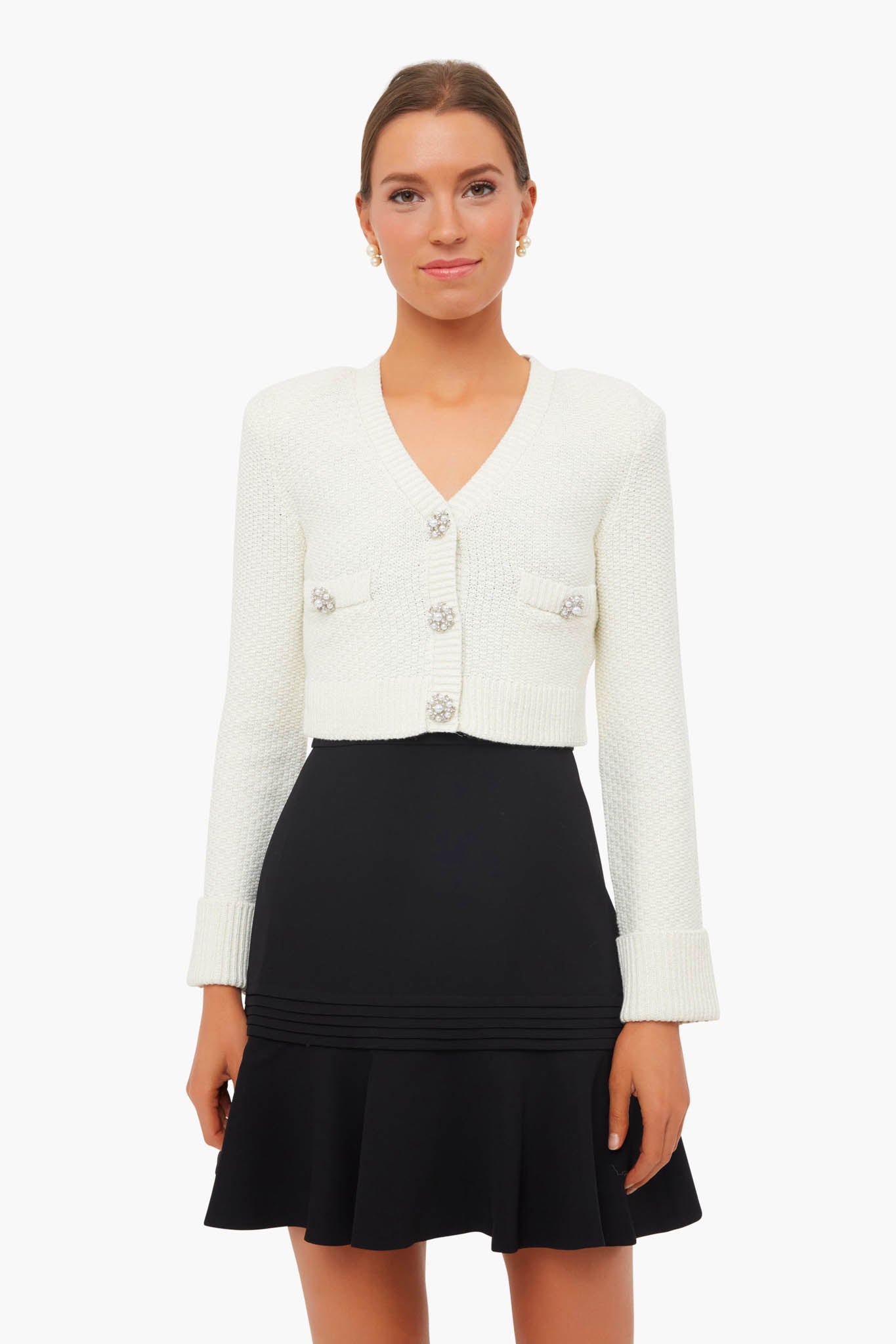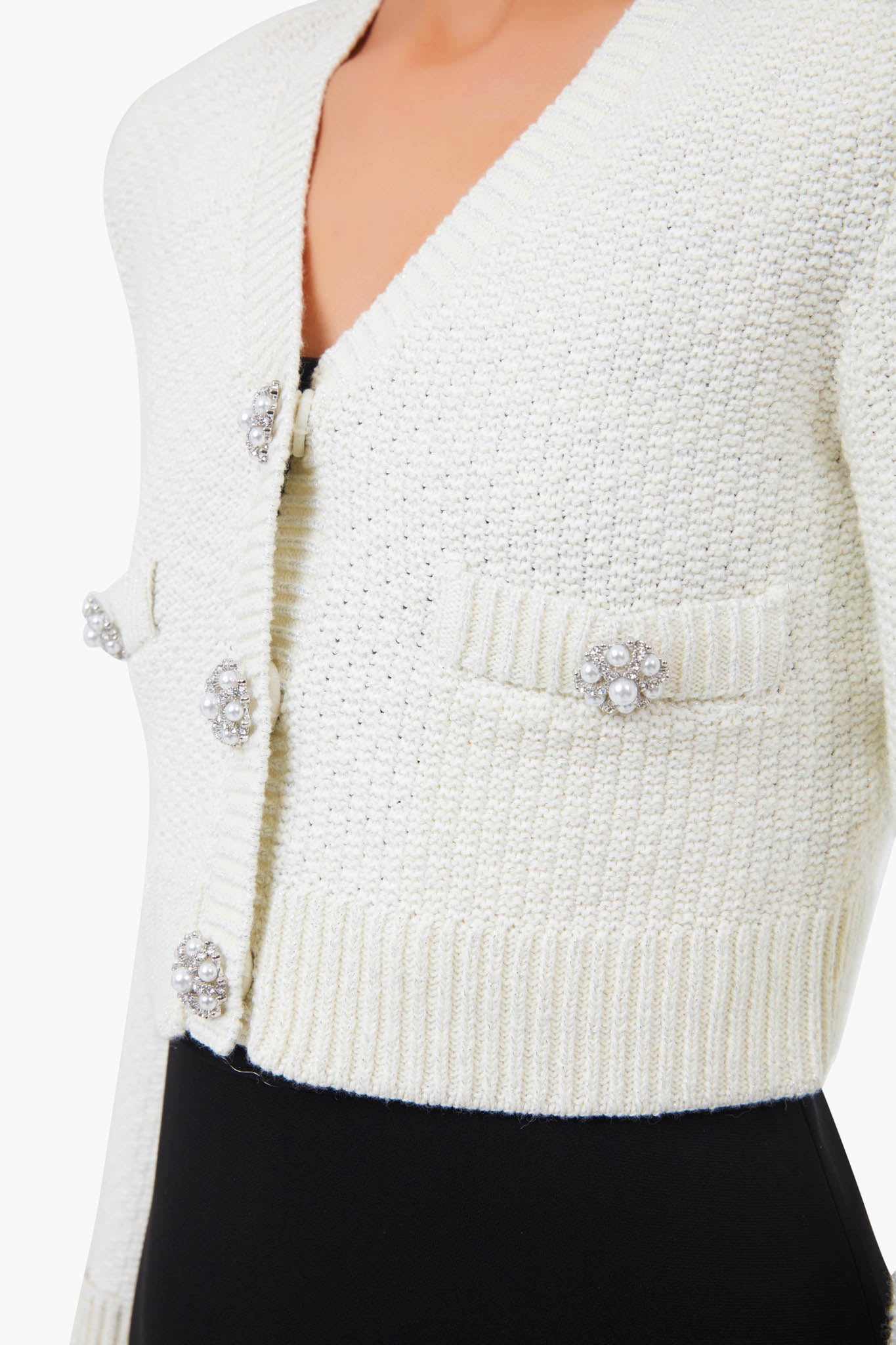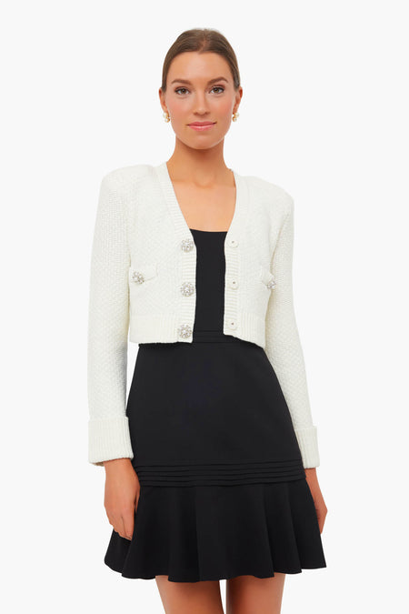 The Ivory Diamante Trim Cardigan is made from a luxurious wool blend and designed with a v-neckline and pearl diamante buttons. This style features patch pockets, a cropped silhouette, and turn-up cuffs on the sleeves. Forever classic and always chic, pair this sweater with a LBD for a retro-inspired look.