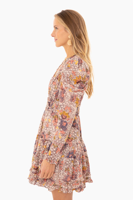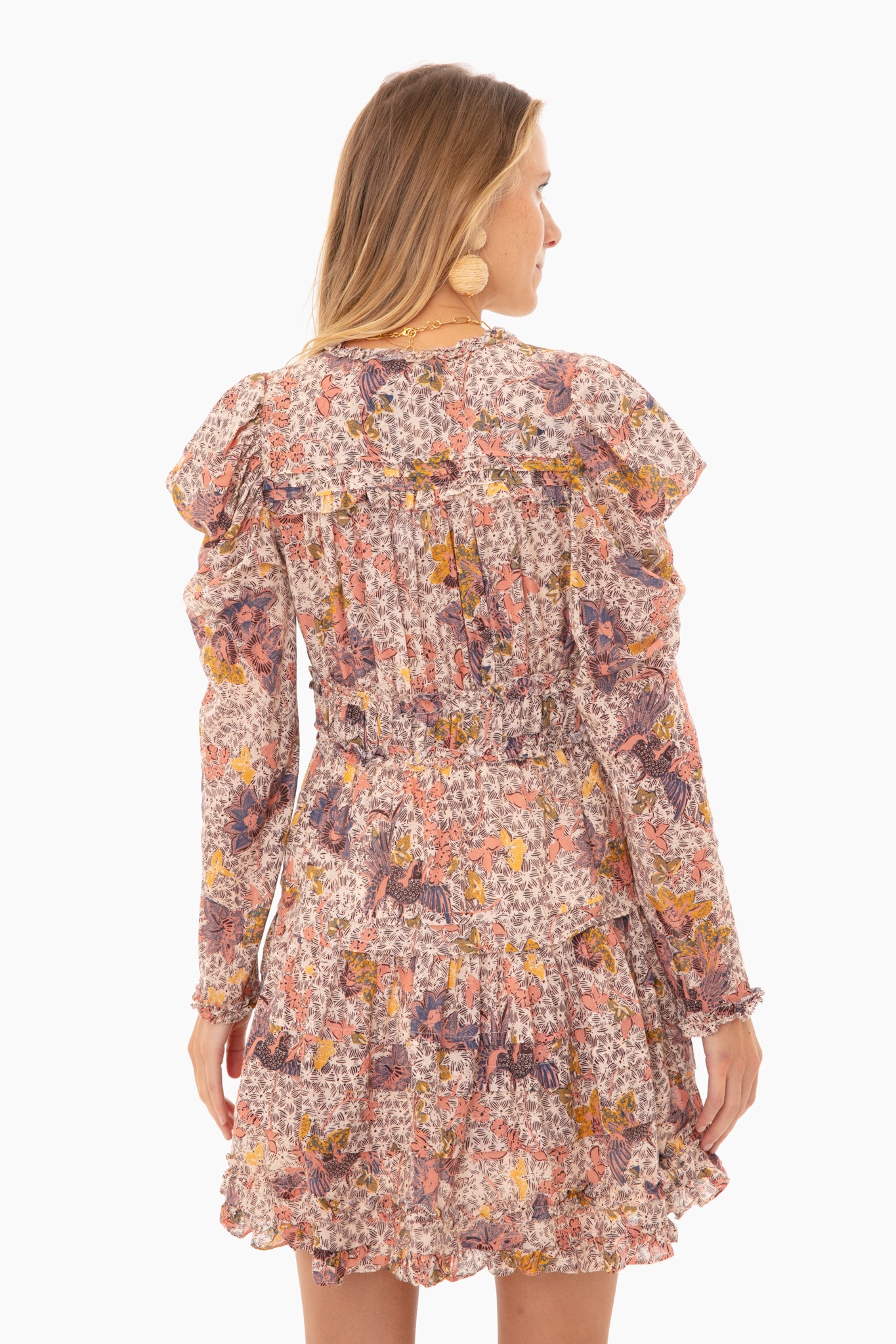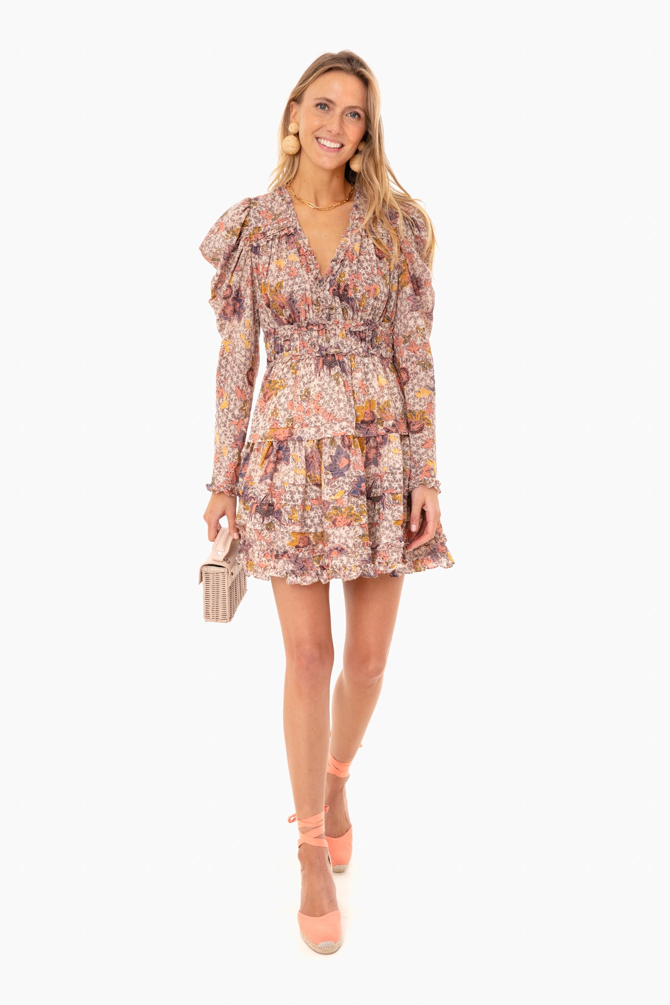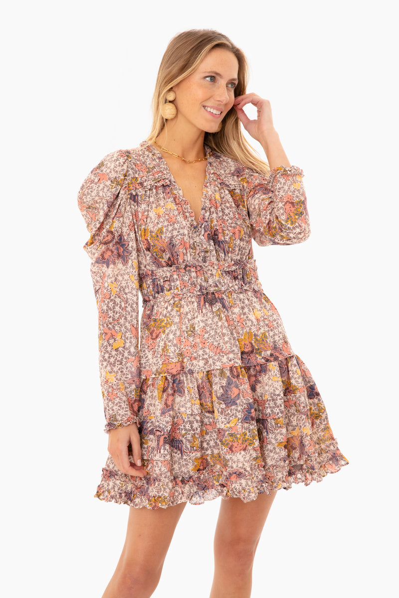 The Julie Dress is the perfect mini dress crafted from a Sunburst Floral printed cotton viscose fabrication. This tiered mini features a deep v-neckline with ruffle detailing, a tiered skirt, voluminous gathered shoulders, and a side zipper closure. Pair with heels for your next fete or flats for brunch with friends.