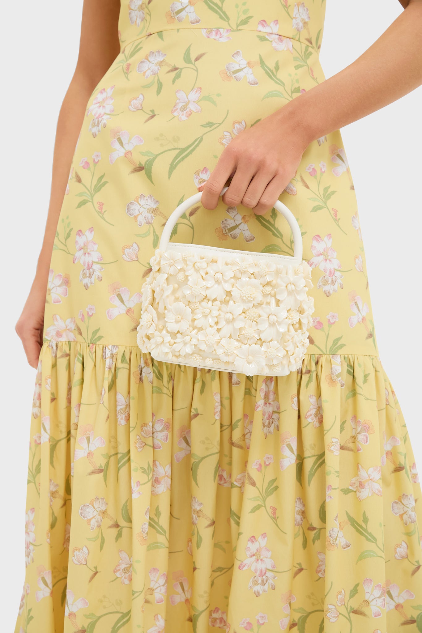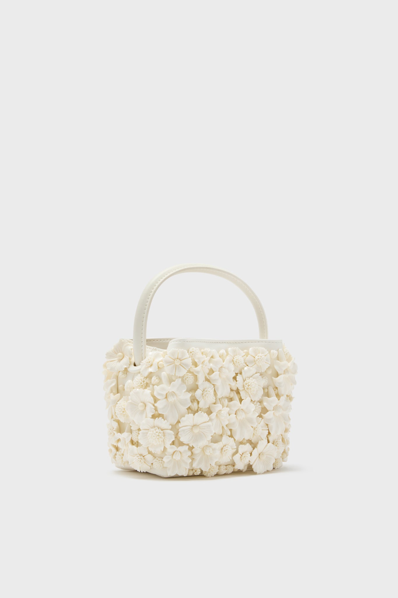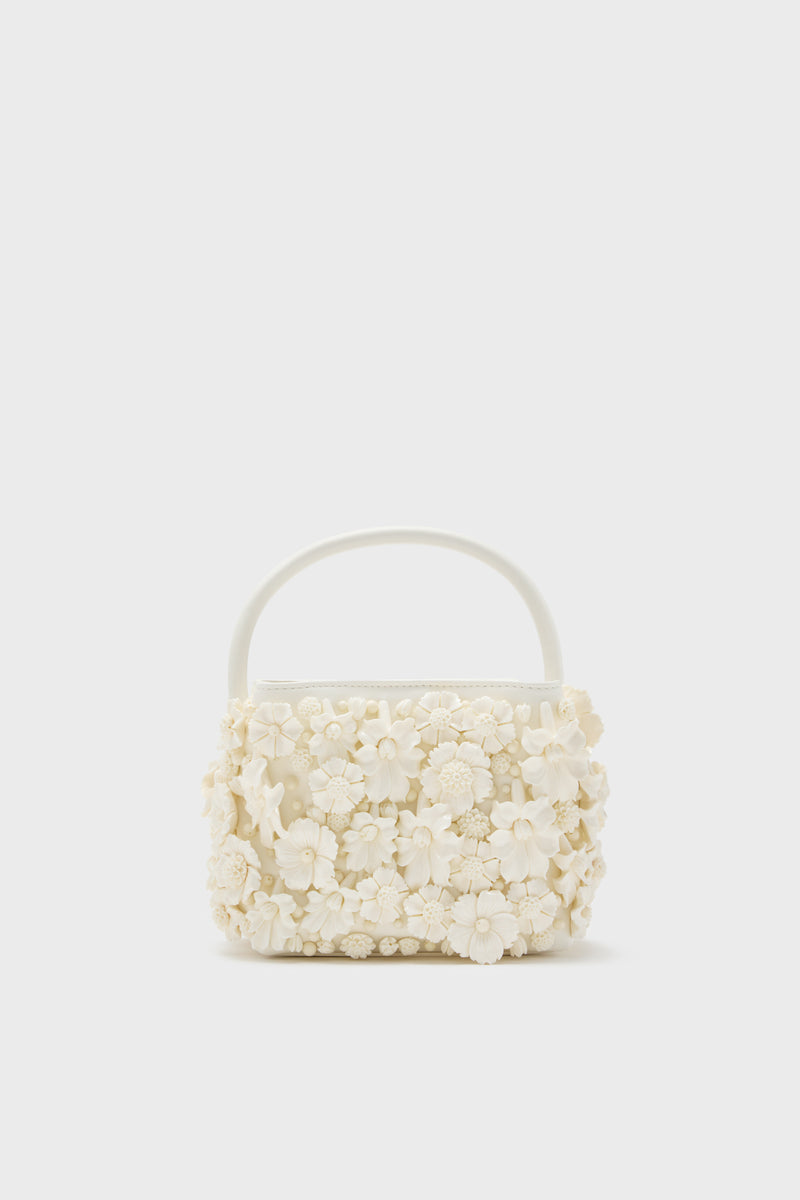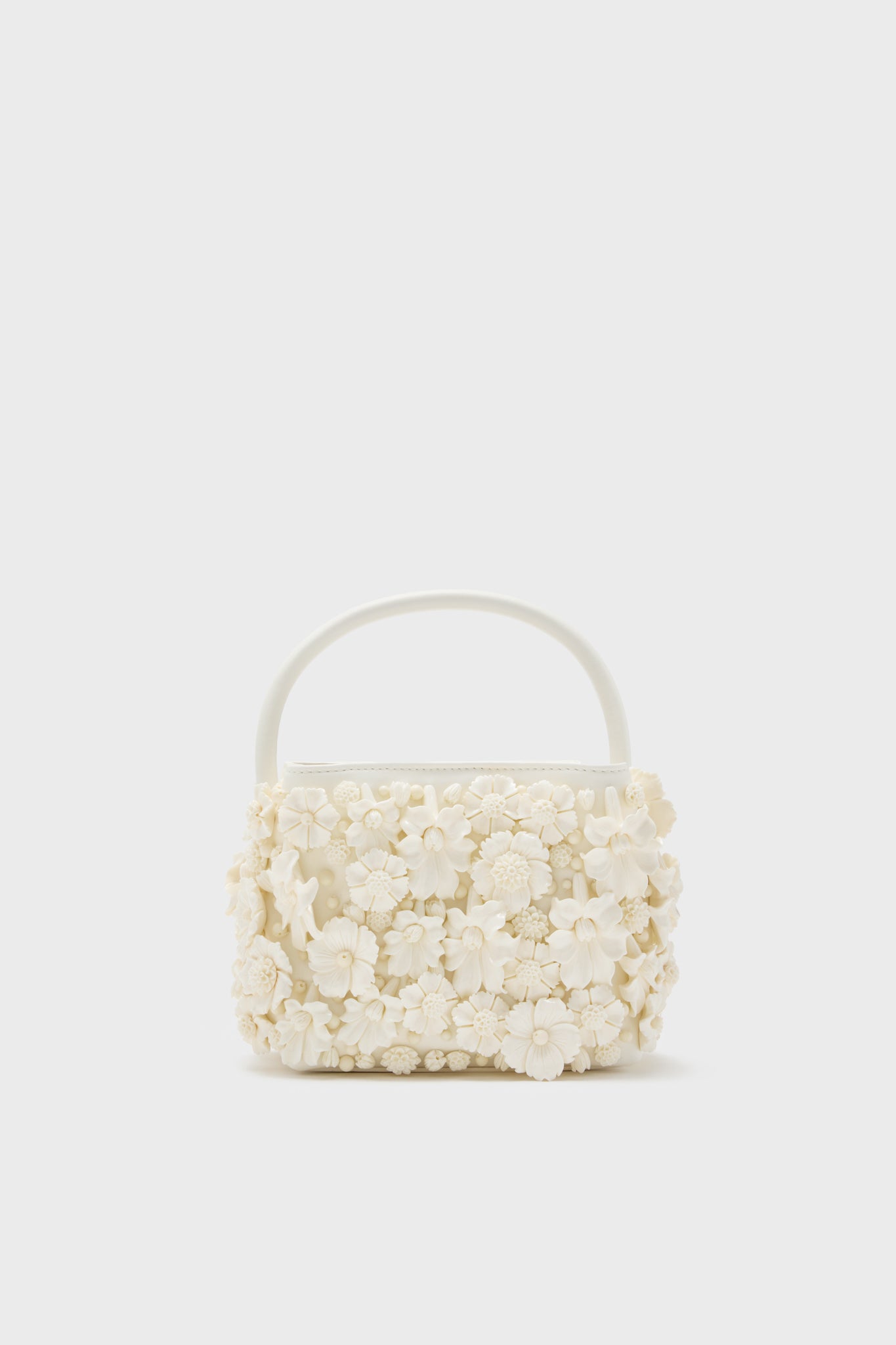 The Ivory Solene Mini is a little bag with a big personality. Crafted from leather and covered in delicate acrylic flowers, this top handle is perfect for brunch, garden parties, or date nights. Style it with sundresses, linen sets, and anything that needs a touch of vintage romance.