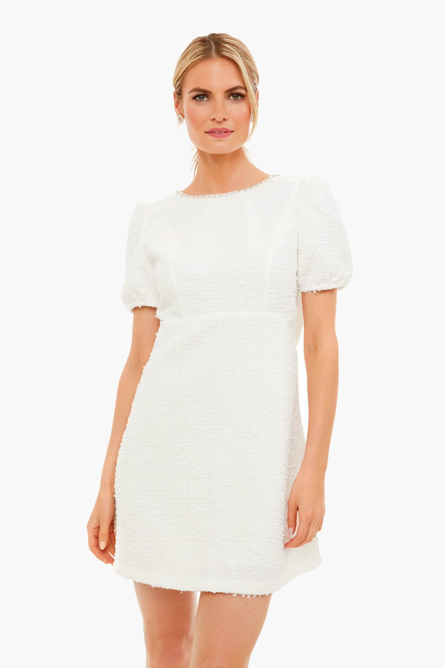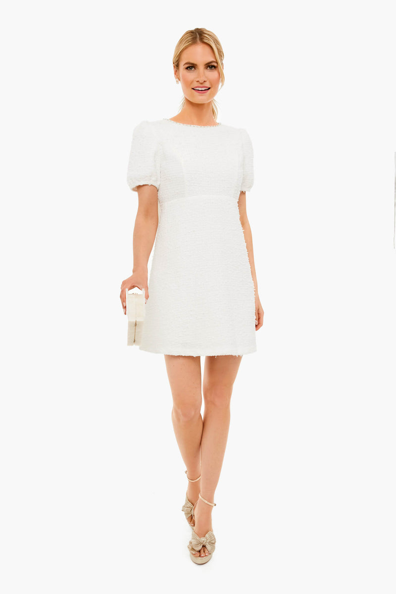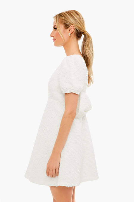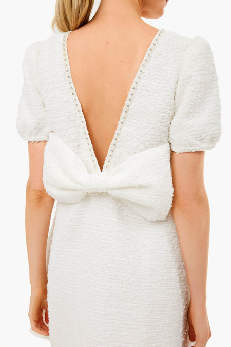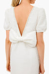 The Ivy Bee Mini Dress finds beauty in the details. Textured tweed and a pearl gem trim add a romantic feel while an oversized bow at the low cut back brings the drama. Perfect for the bride- add glittering heels and a clutch for wedding festivities!