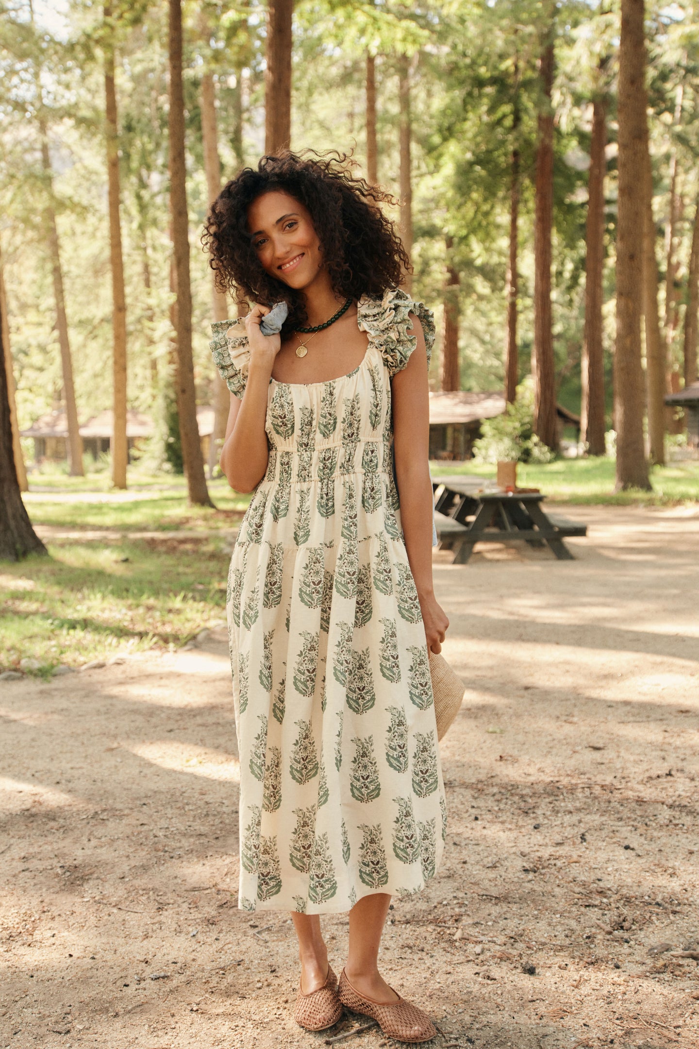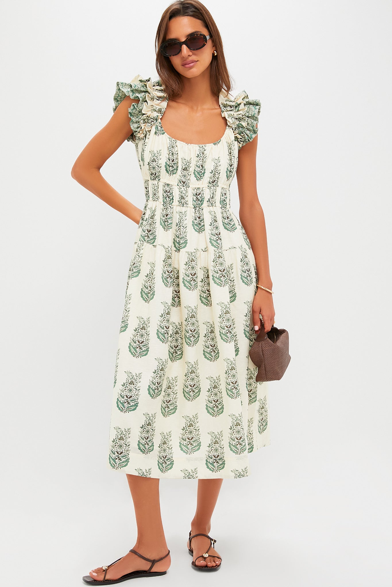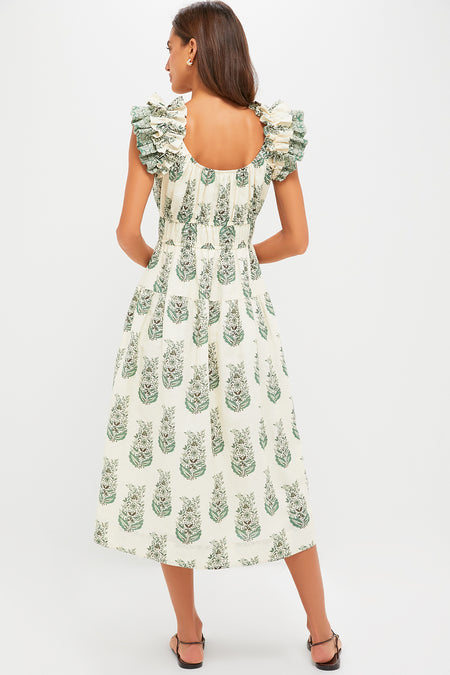The Liana Dress brings playful charm with its ruffled sleeves, smocked bodice, and breezy silhouette. The soft green floral print feels fresh and timeless, perfect for picnics, brunches, or getaway weekends. Pair it with sandals and sunglasses for day, then switch to espadrilles and a bold earring for dinner.