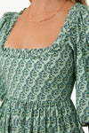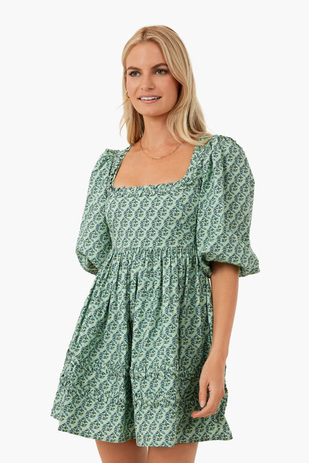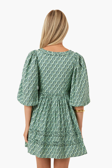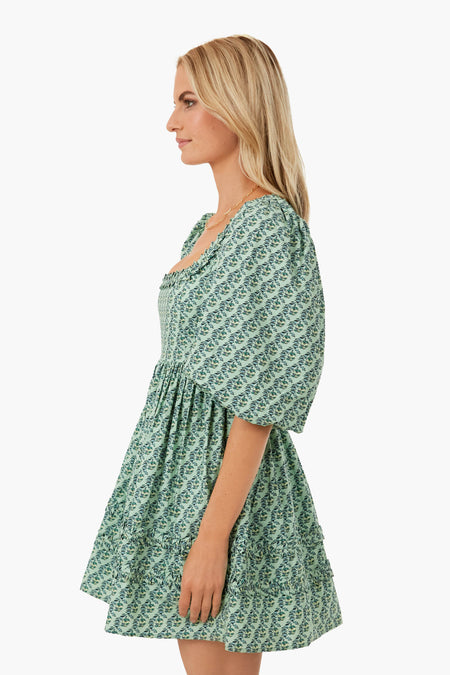In a fresh, floral design, the Jawahar Garden Mint Daya Dress is a mini with lots of personality. Made in a crisp cotton poplin, this number has a flattering darted bust and a full, flowy skirt. A unique pleated neckline and detailing towards the hem add a special flourish that’s elegant without being over the top. Perfect for brunch, farmers’ markets, and dinners al fresco, pair this number with sandals or heels and gold accessories.
