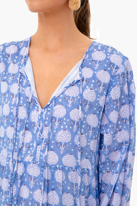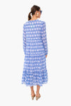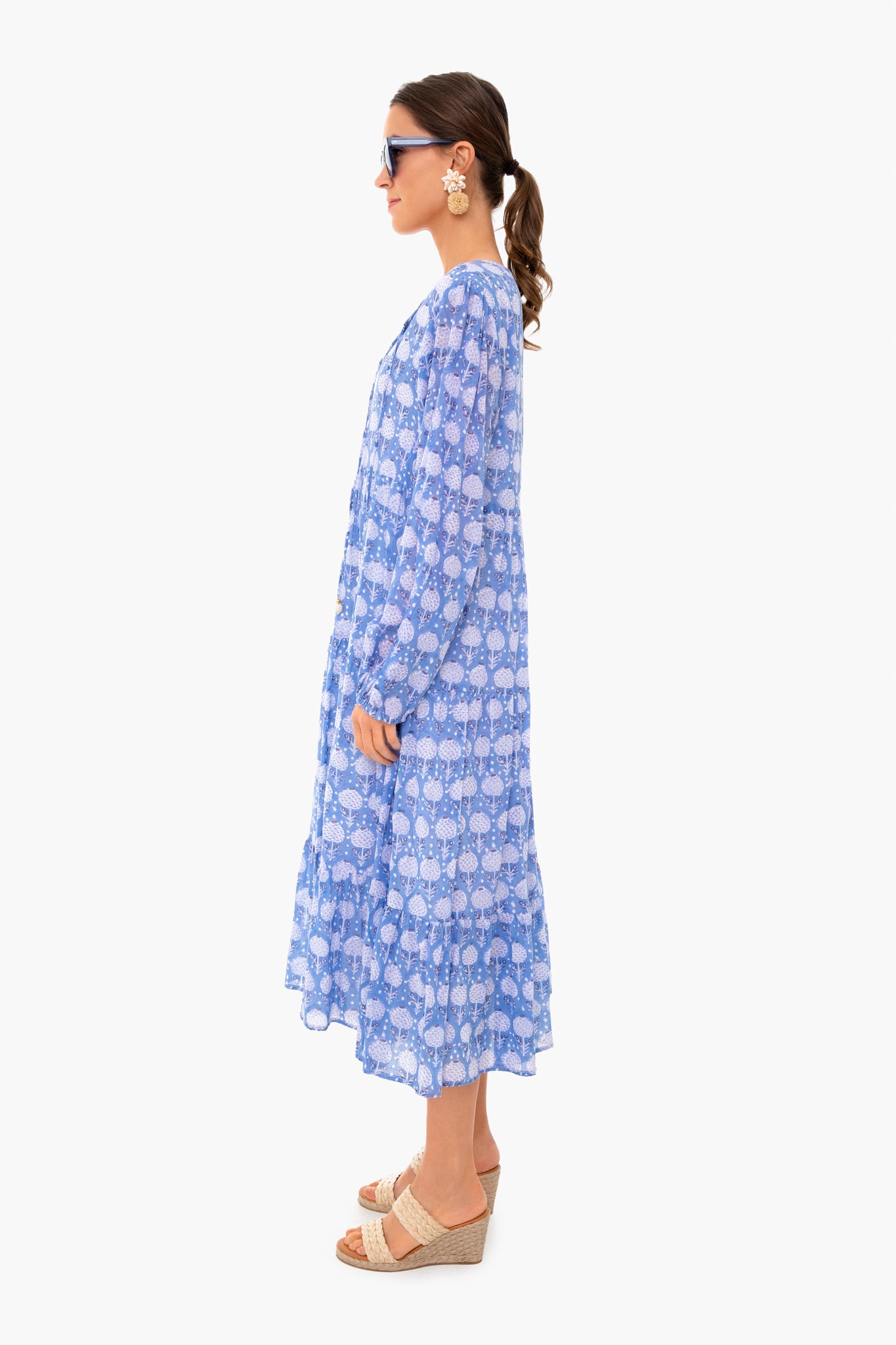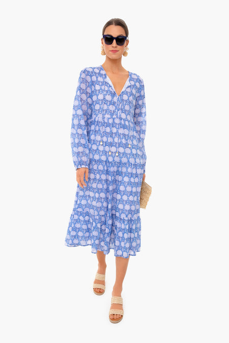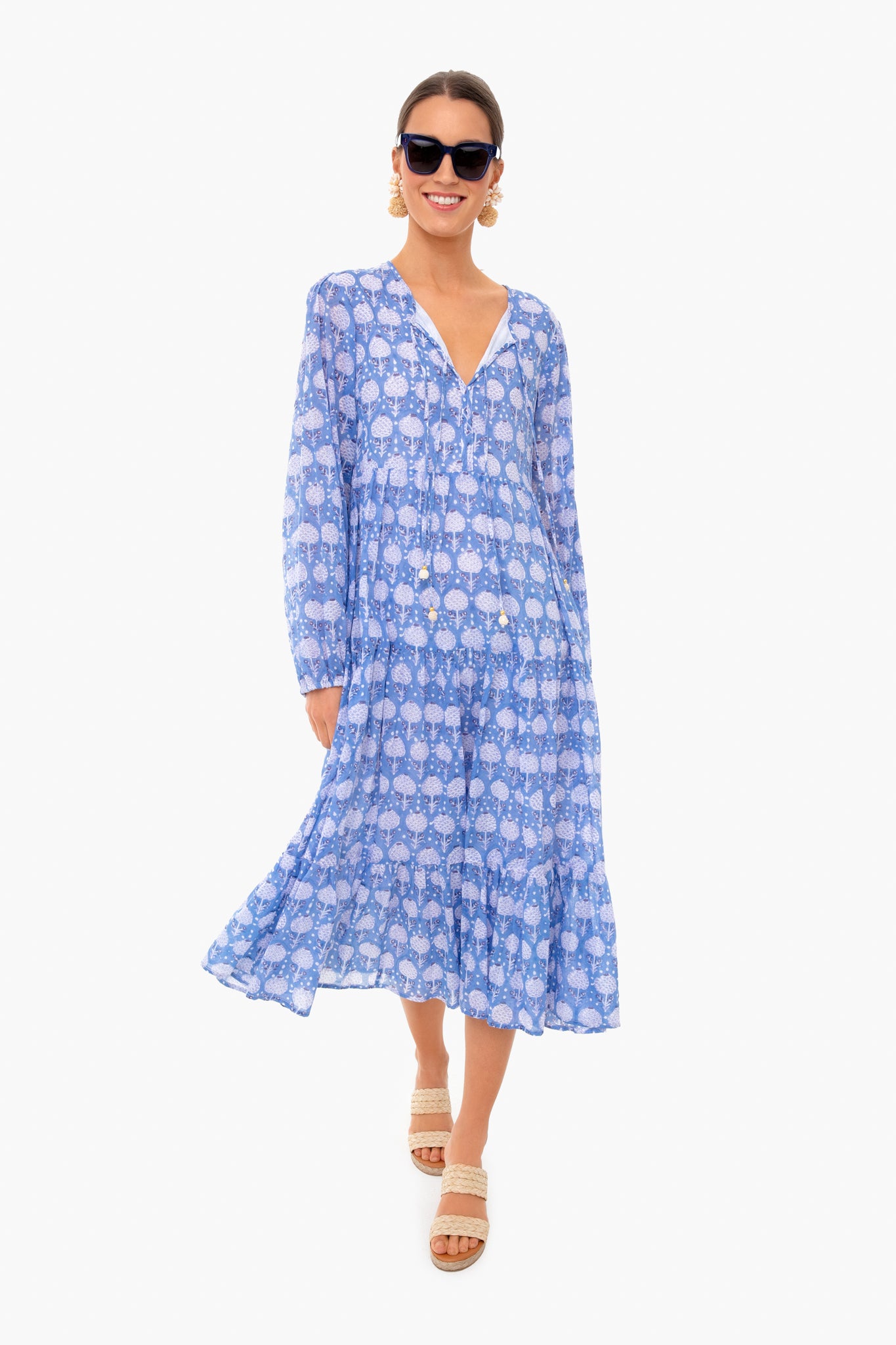 The Kerachi Blue Long Sleeve Midi Dress is made from a breezy block printed cotton. This style features a split neckline, long blouson sleeves, and a tiered midi skirt. Pair with raffia accessories and sandals for an island-inspired date night look.