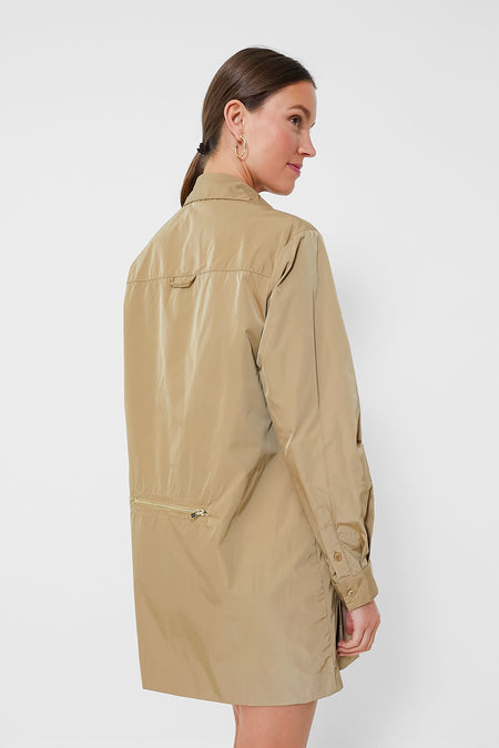 We are loving the safari-chic vibe of the Khaki Backpack Dress. Inspired by utility jackets and their incredible functionality, this mini has a polished collar and long sleeves with button cuffs, a smooth nylon composition, and plenty of pockets adorning the silhouette. Elegant in its simplicity, this style exudes cool-girl style when paired with sneakers and gold jewelry to run errands around town or with strappy sandals and sunnies while sipping a glass of wine by the coast.