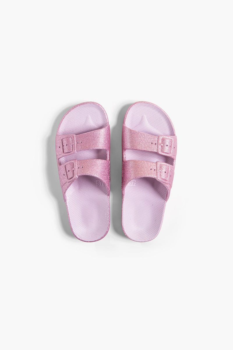 Freedom Moses is all about celebrating summer 365 days a year. From am to pm, the kid's vegan & recyclable slides are injected with air so you feel like you’re walking on a cloud. Whether chilling at the beach or just hanging out, any of the prints, glitters, metallics or basic colors will be the perfect throw on.