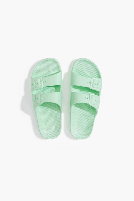 Freedom Moses is all about celebrating summer 365 days a year. From am to pm, the kid's vegan & recyclable slides are injected with air so you feel like you’re walking on a cloud. Whether chilling at the beach or just hanging out, any of the prints, glitters, metallics or basic colors will be the perfect throw on.