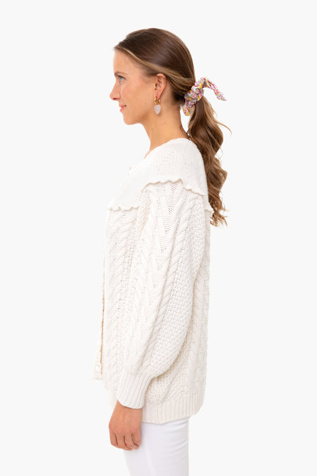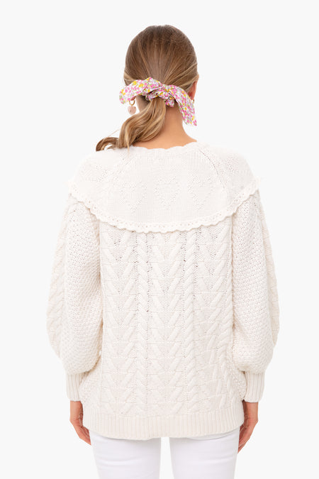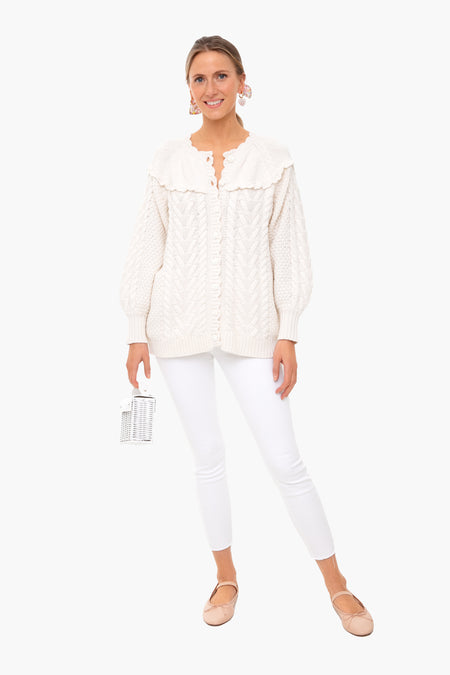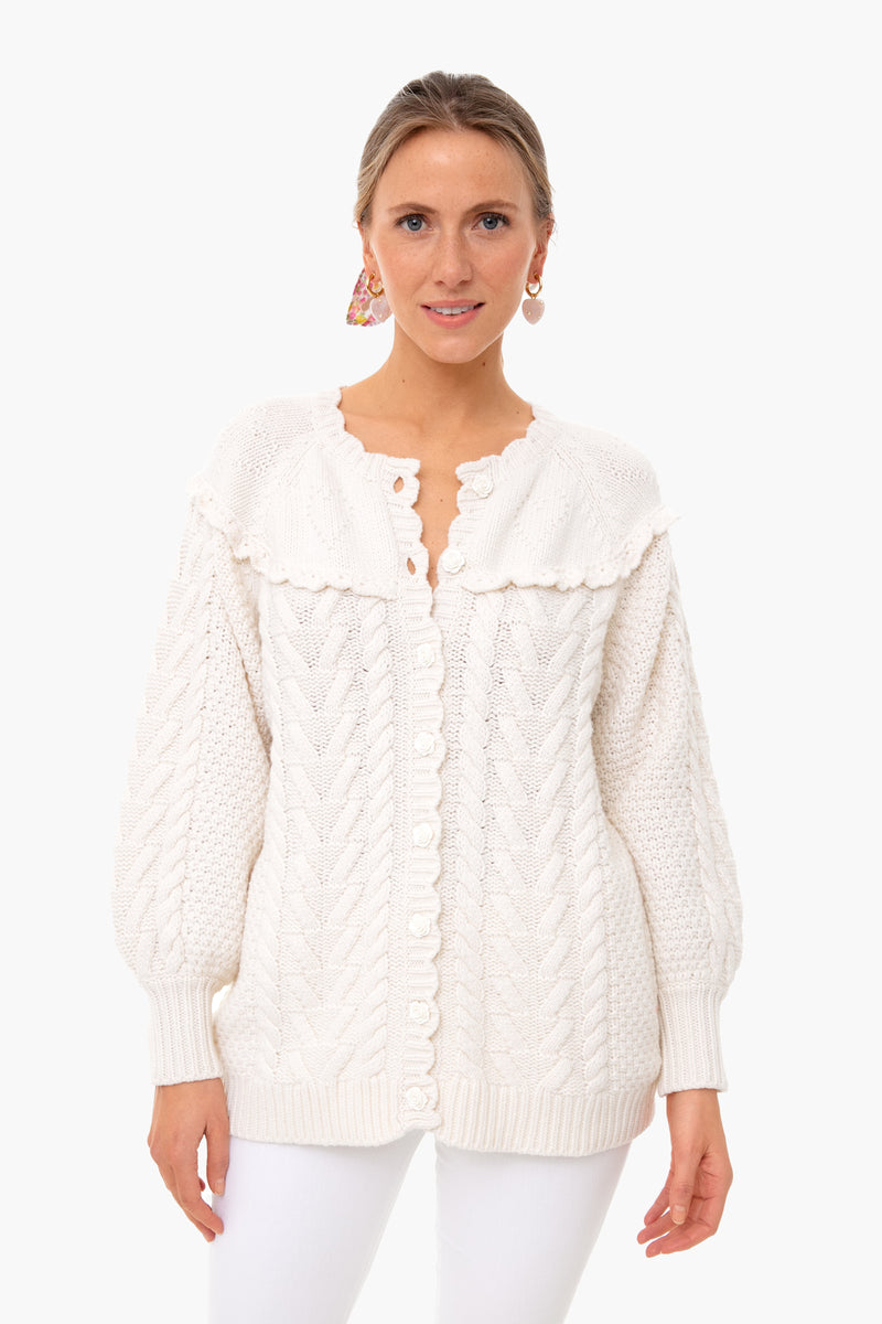 Snuggle up in the Lake Boyfriend Cardigan which features a mix of cable-knit and seed stitching with a heart motif at the yoke. This oversized cozy sweater has a ruffle detail that encircles the front and back. Rose buttons adorn the front for a feminine and romantic touch and perfectly compliment the scallop trim neckline.
