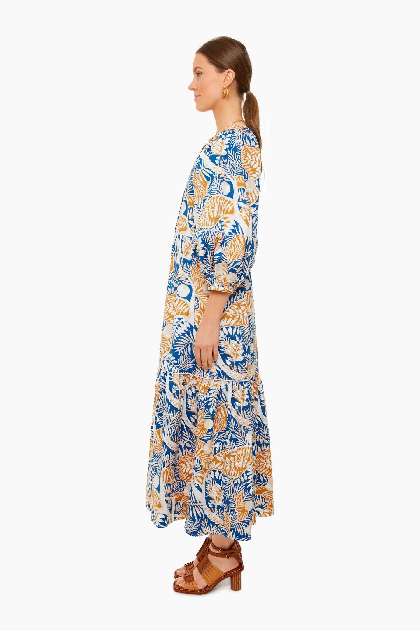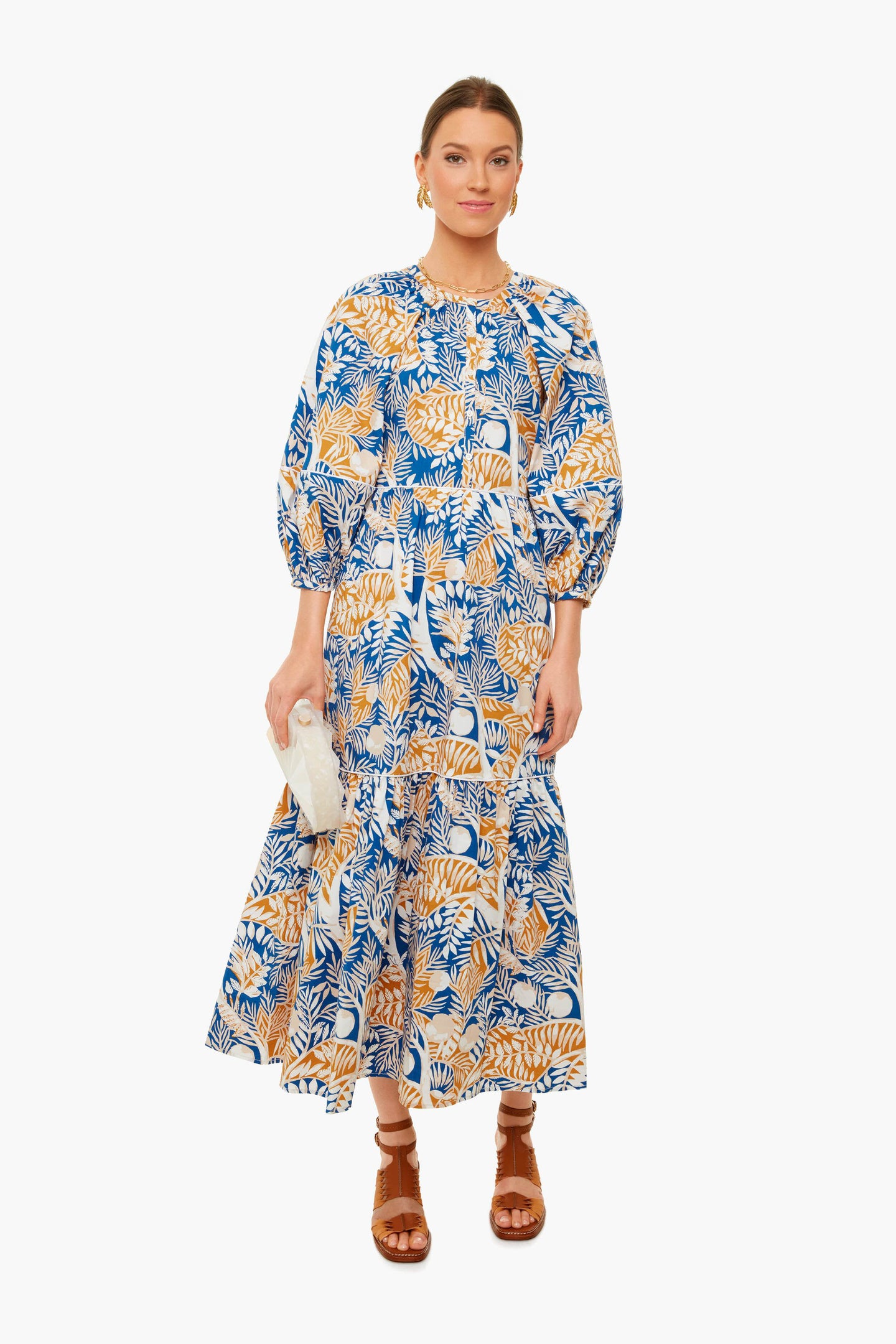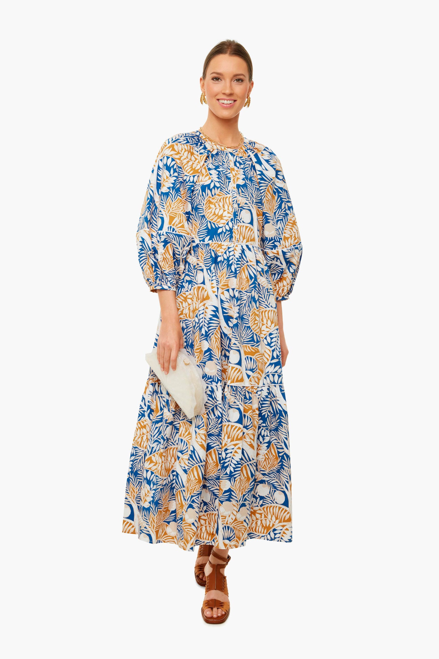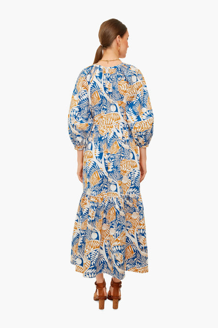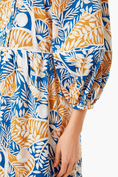 The Land And Sea Tree Demi Dress is made from crisp cotton with contrast white trim in a tropical print. This midi has a button front placket, full skirt, and three-quarter oversized blouson sleeves. Wear with sunglasses and sandals for a vacation-ready, sun-kissed look.