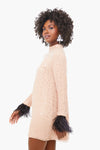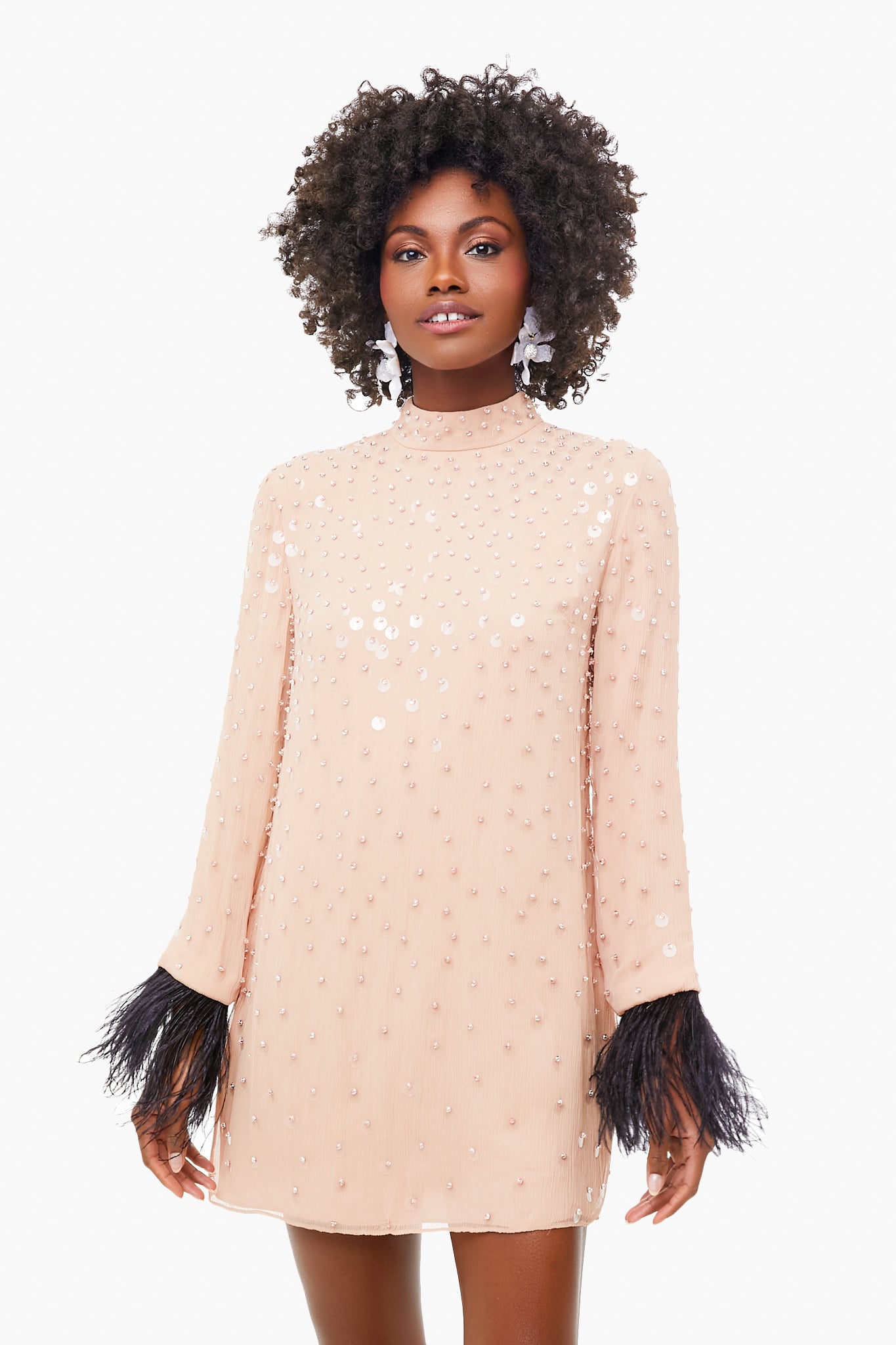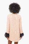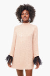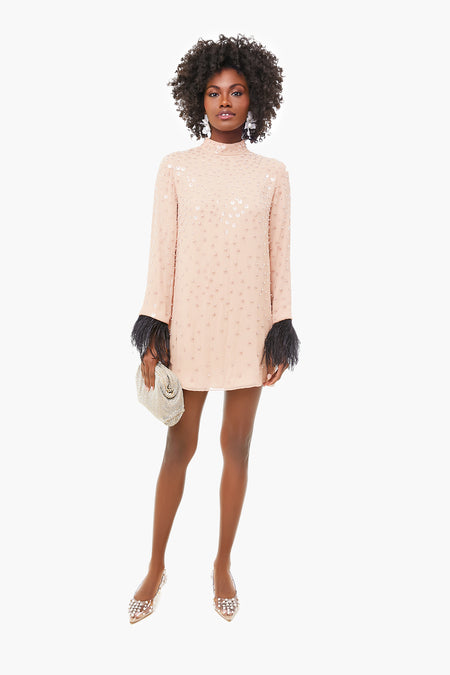 You are sure to command the room in The Lazar Dress. Cut from delicate blush chiffon and adorned with crystal and paillette, this dress features a mock neck and contrasting ostrich feather trim at the cuffs. The show-stopping details of this opulent mini radiate femininity and sophistication. Add sparkling accessories for a look that will make you the best-dressed guest!
