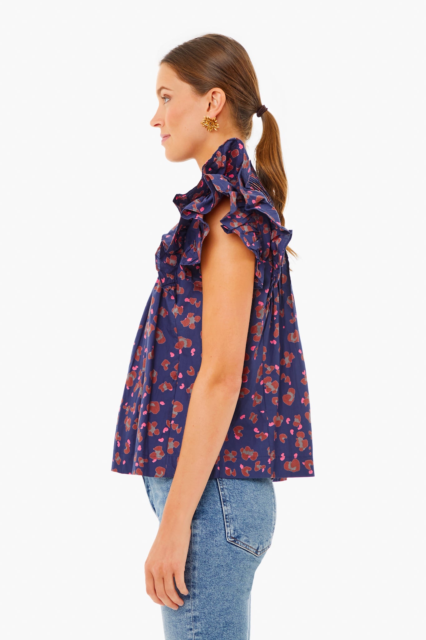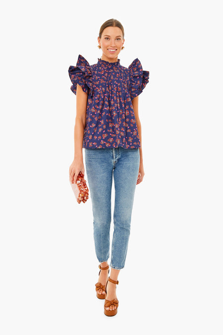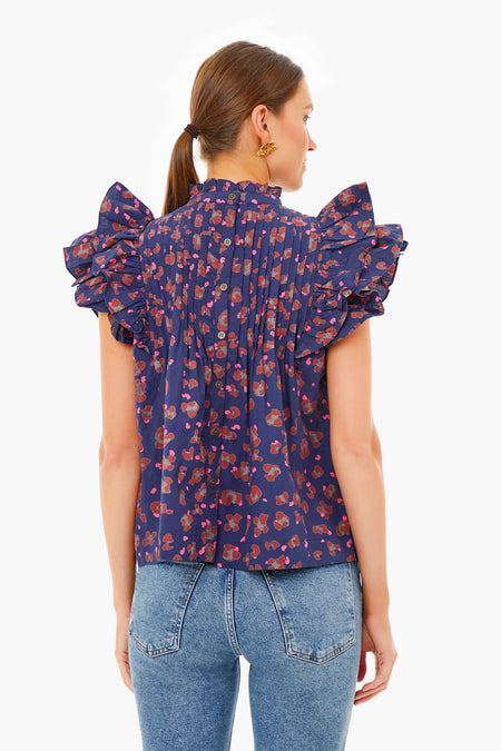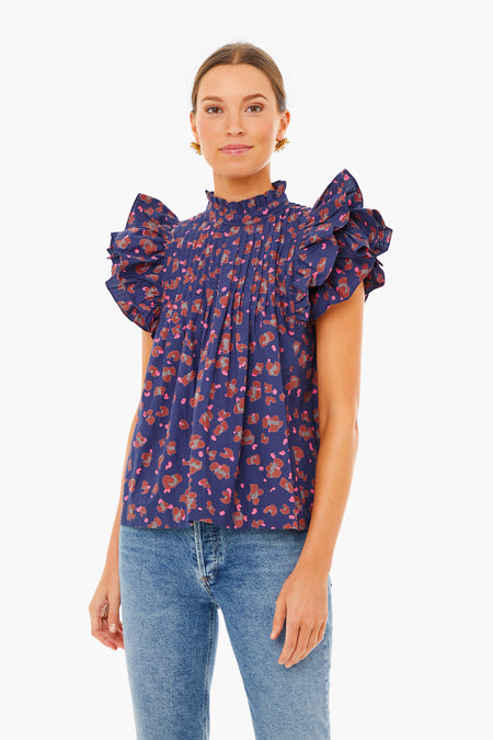 This ruffle sleeve top features a high neck, pintuck bodice, and buttons down the back. With a bold print throughout, this style is whimsical and romantic. Pair with gold earrings and denim for a fall-inspired look.