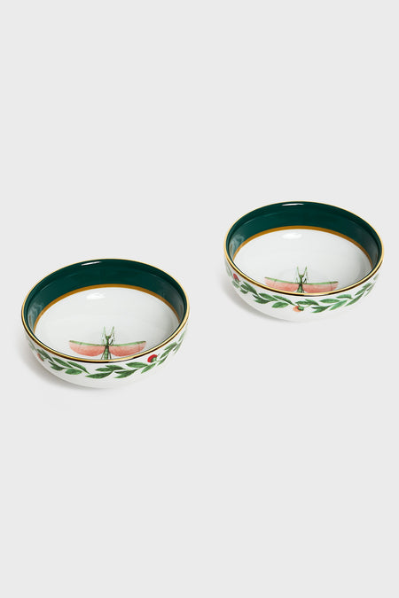 Turn your hangry into happy, stat. The Libellula Snack Bowls (Set of 2) trimmed in gold, is the perfect size and shape for your midnight munchies and morning pick-me-ups alike.