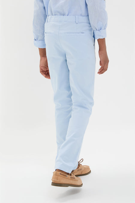 Every young man needs a classic chino. Say hello to the Light Blue Elio Chino Pants. Featuring a classic slim fit style with a handcrafted button placket and zip to fasten, belt loops, slant front pockets and concealed pockets at the back. Modify for the perfect fit with the internal waist adjuster, with an elasticated waist and hidden buttons to make the waistline smaller or larger, ensuring your little one gets as much wear out of this classic style.