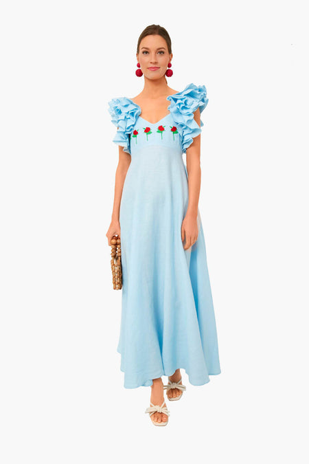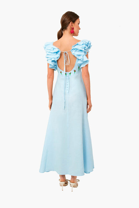 The Light Lagoon Demre Embroidered Dress is cut and sewn by hand. A unique treasure, this colorful maxi features a v-neckline, ruffle flutter sleeves, and a deep scoop back with a tie. Add sandals and a tote and you are sure to be best-dressed at your spring events!