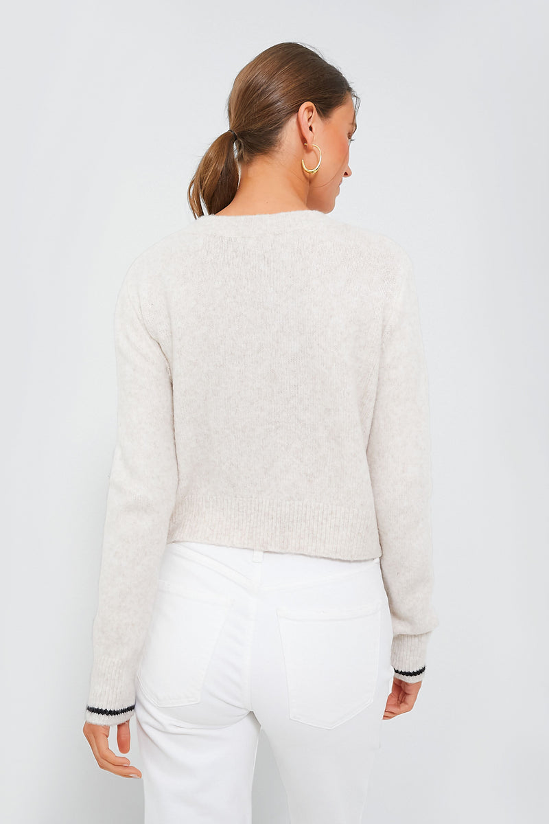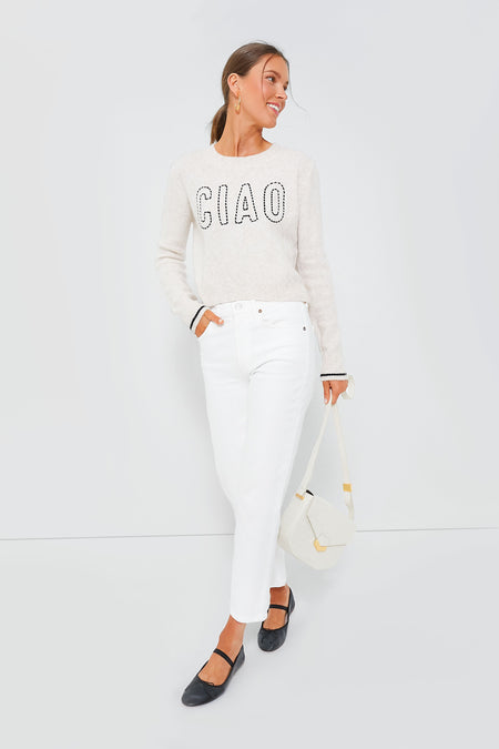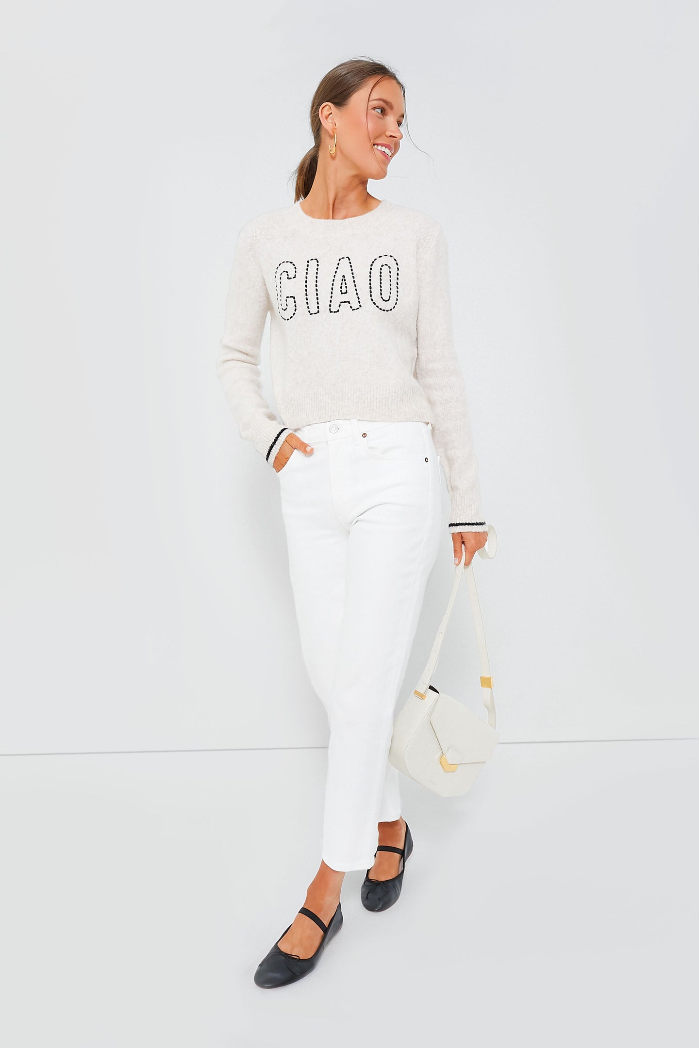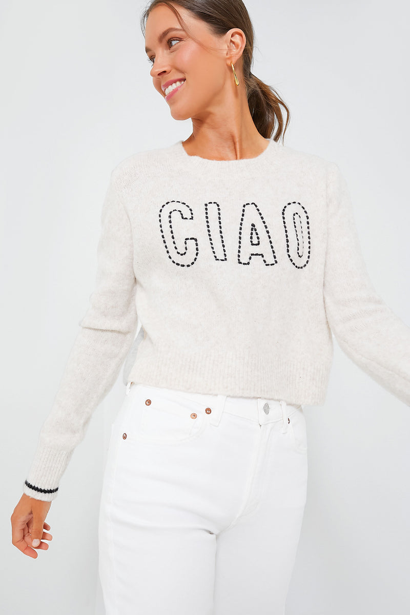 Made from super-soft yarn, the Light Oatmeal Milan Sweater is sure to make a statement. Featuring chain stitch lettering of our favorite Italian greeting, ribbed cuffs with a contrast stripe, and a slightly relaxed fit that is ultra-cozy, you'll want to wear this knit nonstop. Pair with denim and booties for an effortless daytime look, then swap them out for leather leggings and gold hoops for an extra bit of fun.