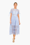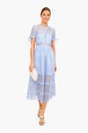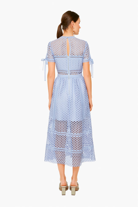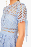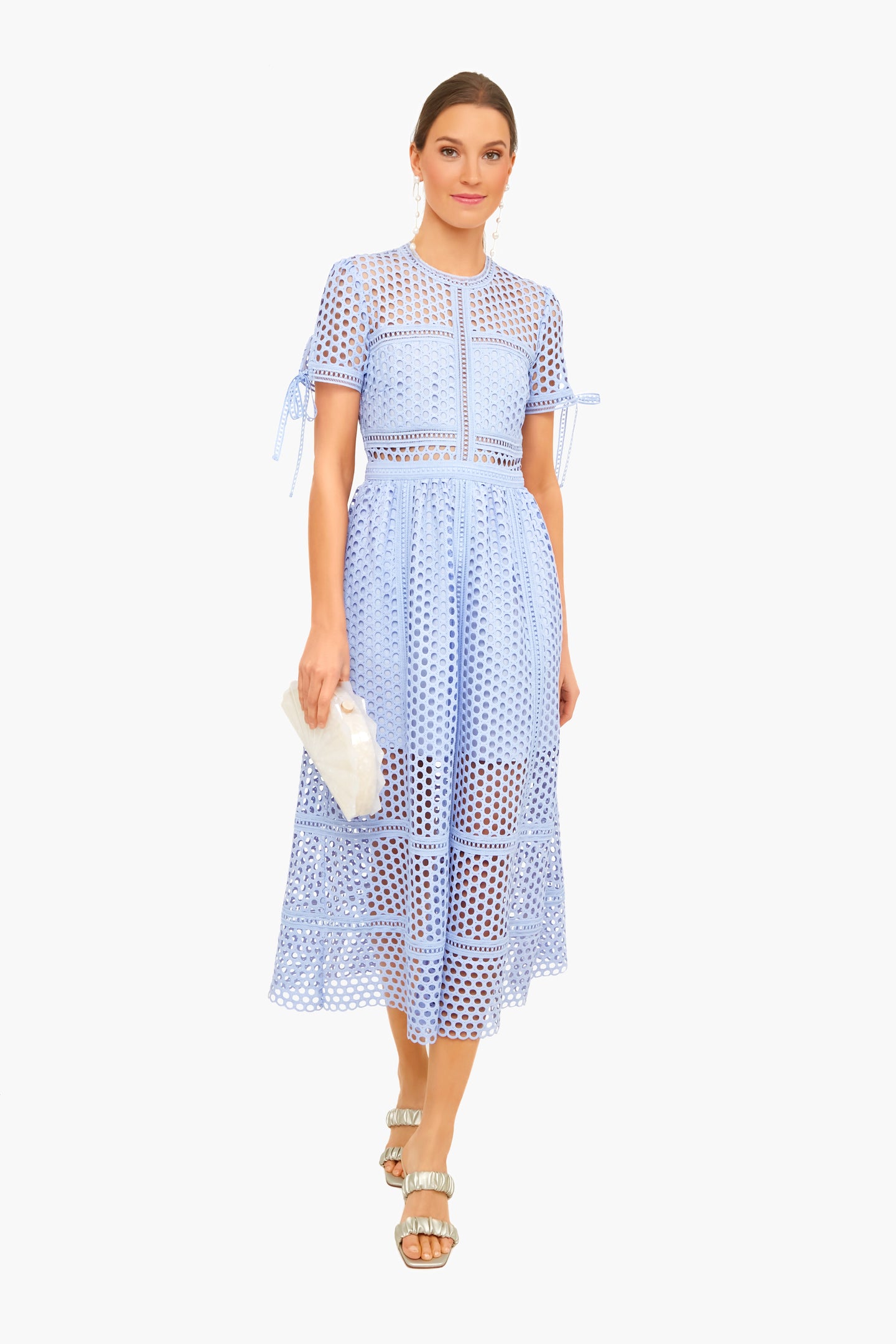 Cement your status as the most stylish guest at every event on your social calendar. Cut from the brand’s signature open-work guipure lace, this lilac midi dress has strategically placed panels for modesty where you need it most. Lace ties at the sleeves add feminine details to the classic silhouette. Add gold and pearl accessories for a romantic and ethereal look.