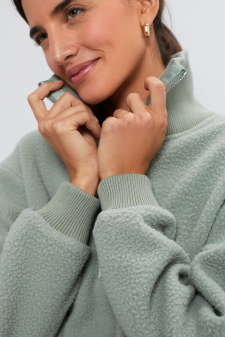 - Oversized collar with quarter zip closure