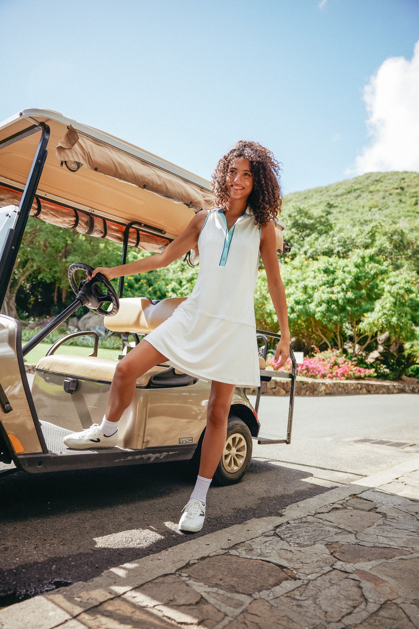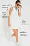 Be the quickest on the court in the Lisbon Piped Sterling Tennis Dress! With a stand flat-knit collar, front button closure, and mini length it won’t restrict your movement when you go to make a killer serve!
