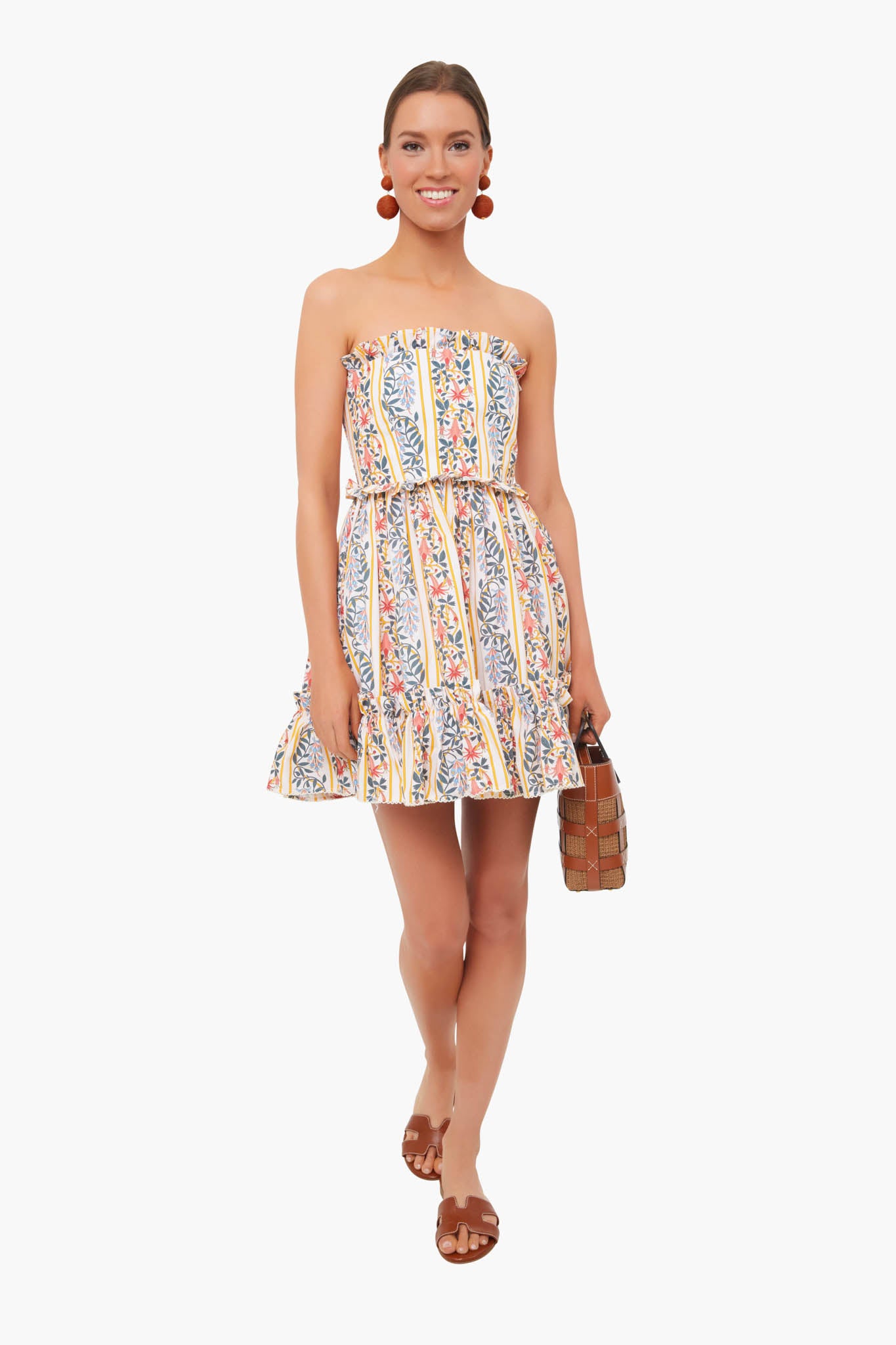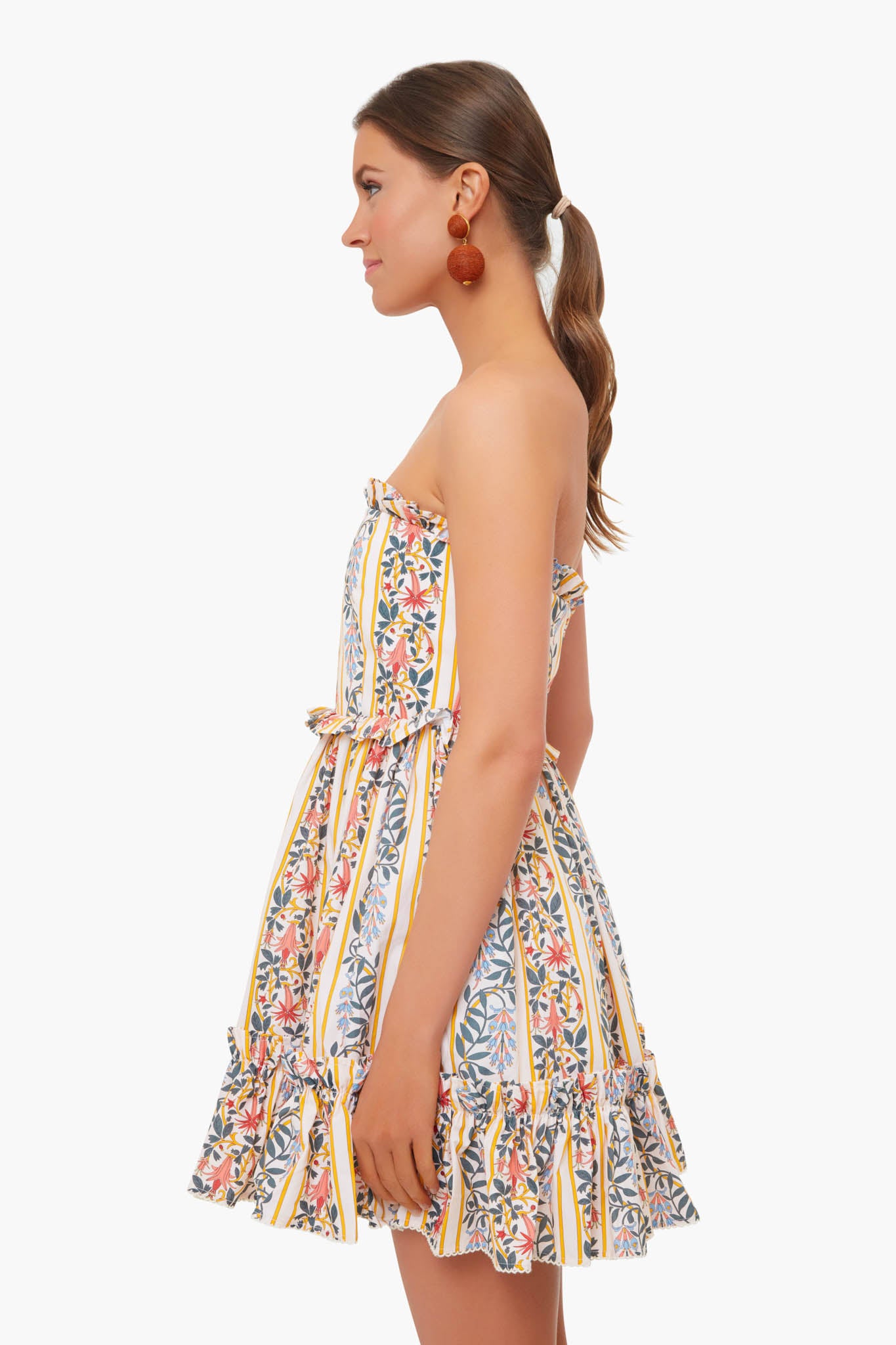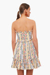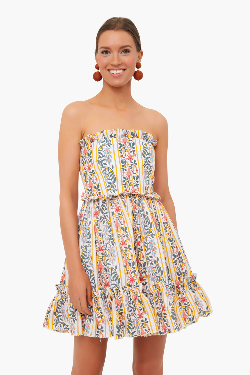 Perfect for your next tropical escape, the Rosa Dress is cut from cotton poplin decorated with linear florals and dainty ruffled trims. A feminine and boho strapless silhouette make this mini perfect for sunny days. Style this for a daytime lunch with flat sandals and a cardigan or for an evening date night with heels and fun jewelry.