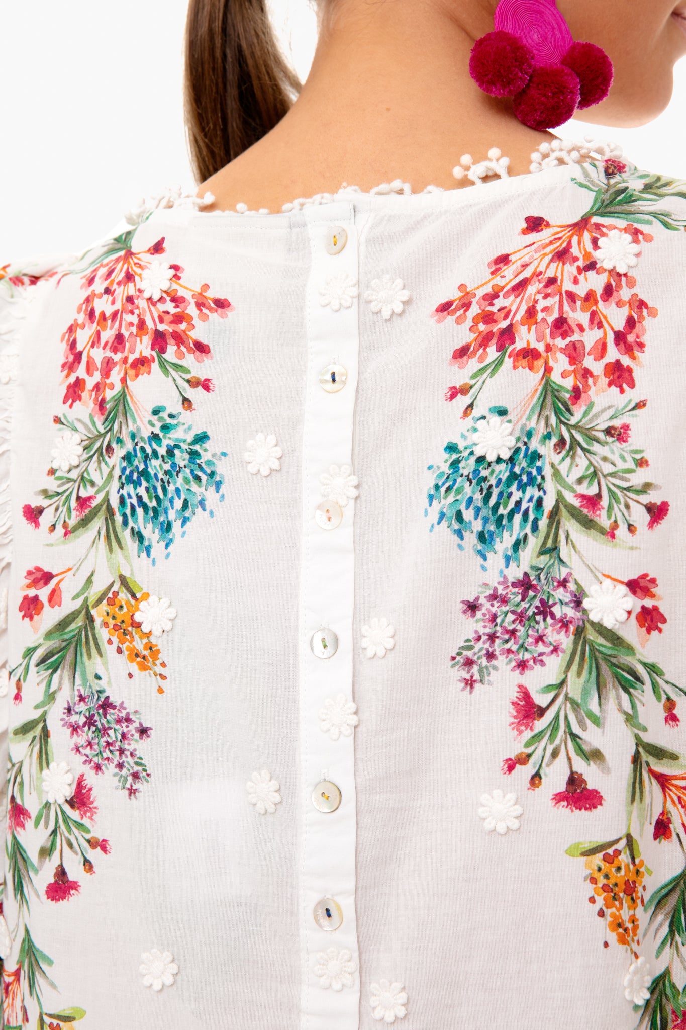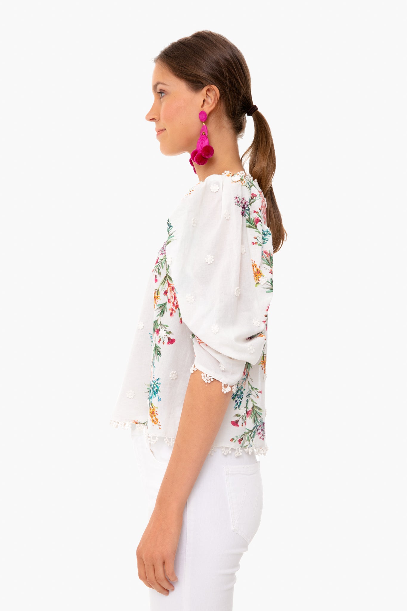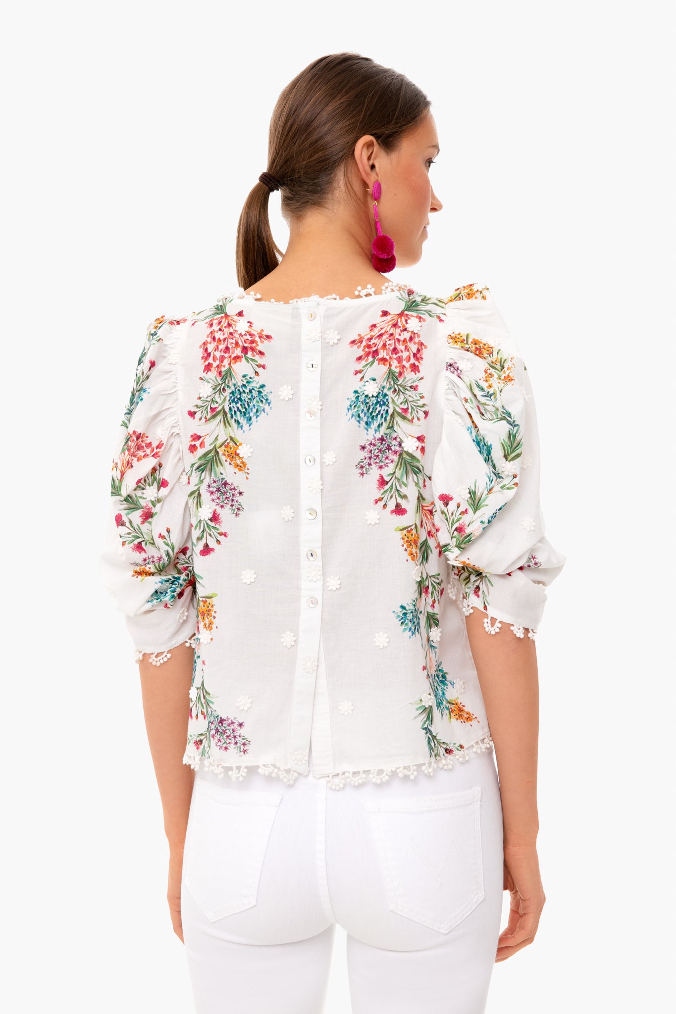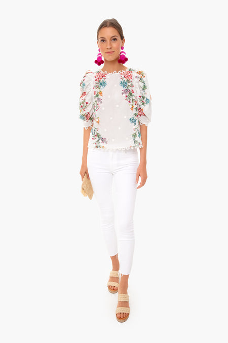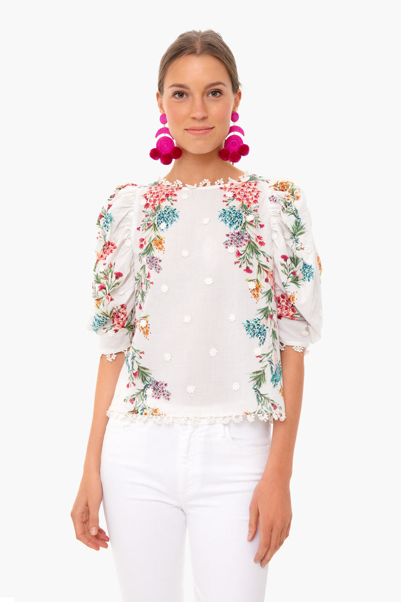 The Louise Floral Blouse has a romantic feel with lace detailing, floral print, and buttons down the back. Featuring a crewneck and puff sleeves, this top is a spring must-have. Pair back to white denim and colorful earrings for a playful look.