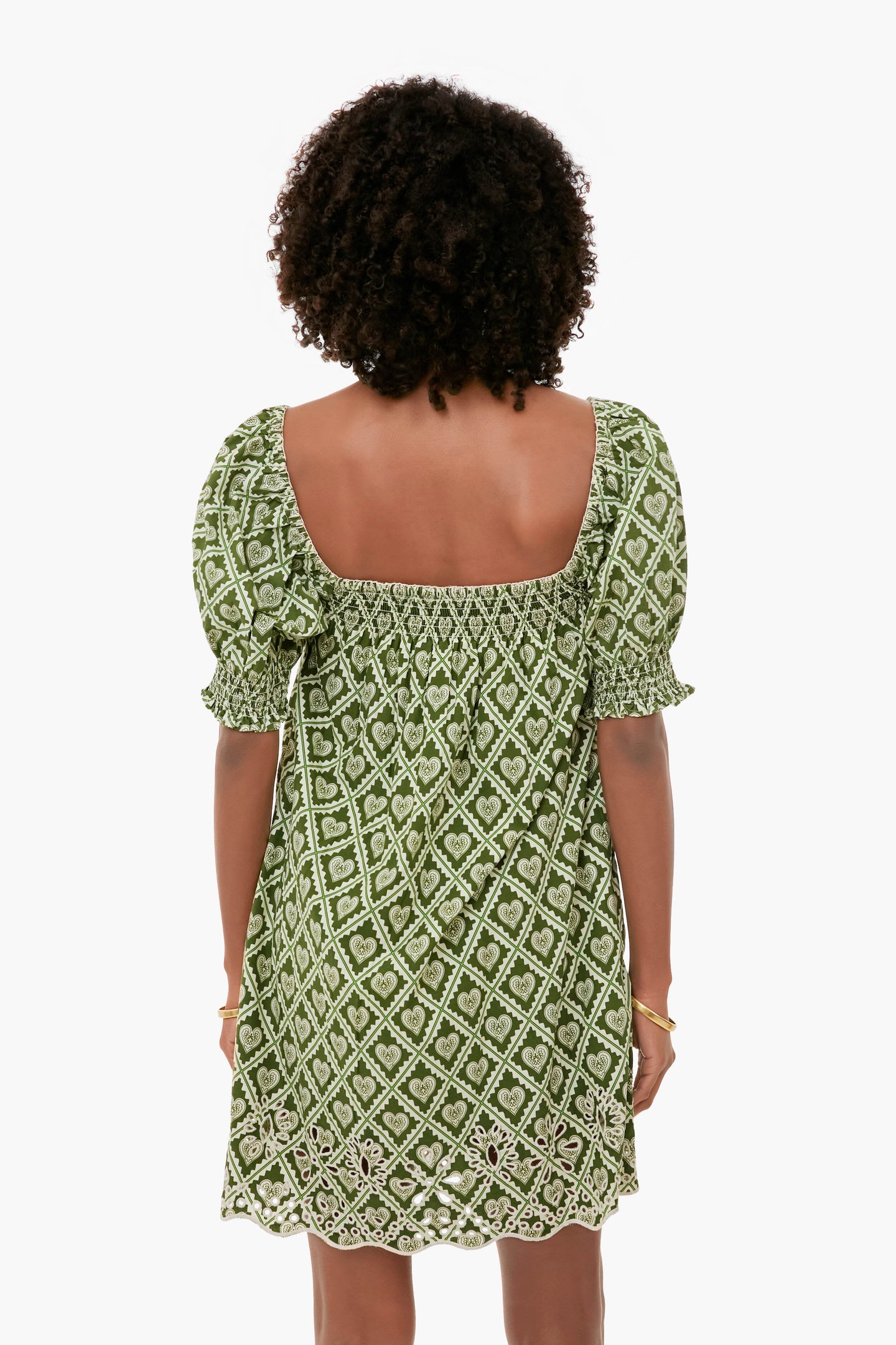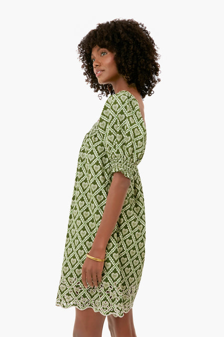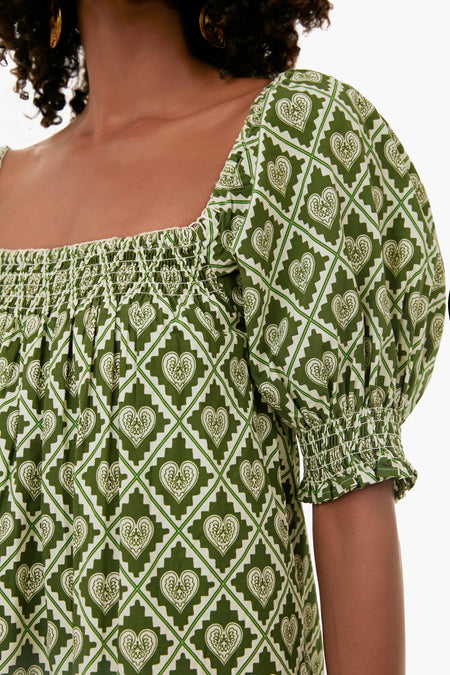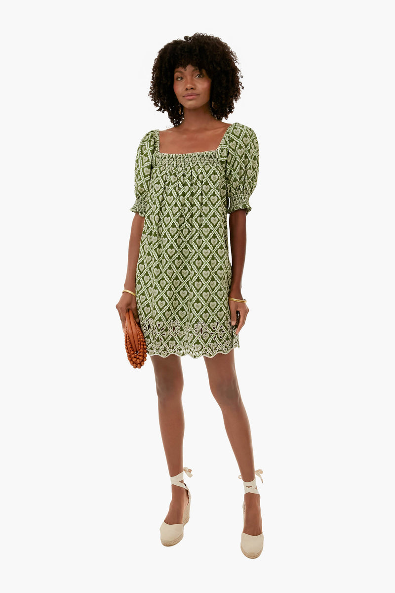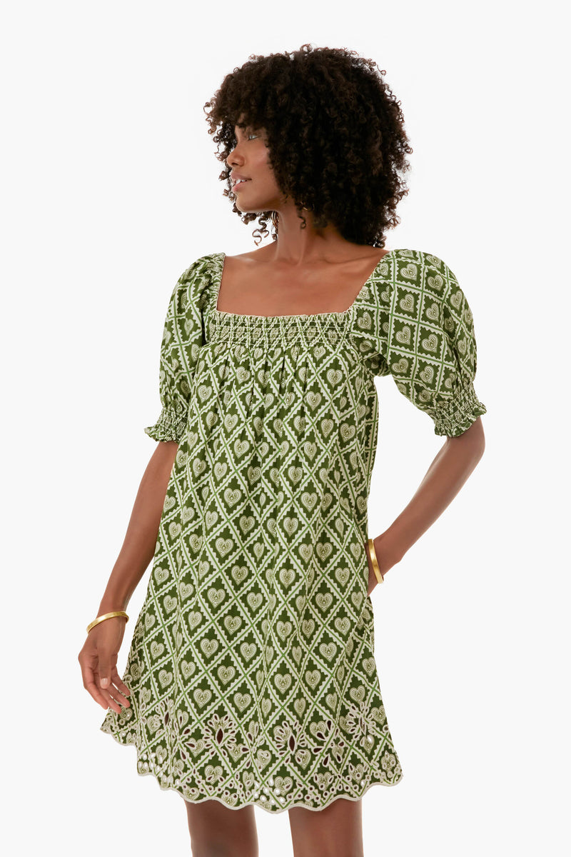 The Evie Dress has a babydoll silhouette with subtle smocking at the square neck and sleeves, creating volume with effortless comfort. Eyelet detailing and a piped scalloped hem add an elevated, handcrafted touch with classic appeal. Made from a crisp cotton poplin, the Love Lockdown Chive print is inspired by the ongoing legacy of lockets as a personal way to keep what matters close. Pair with gold jewelry for a feminine, sun-kissed look.