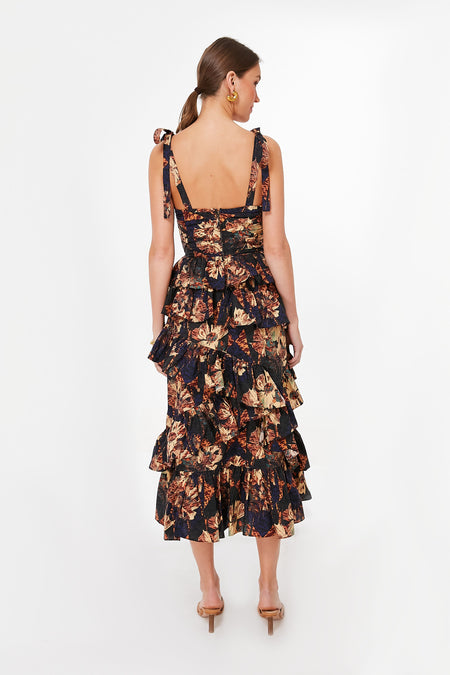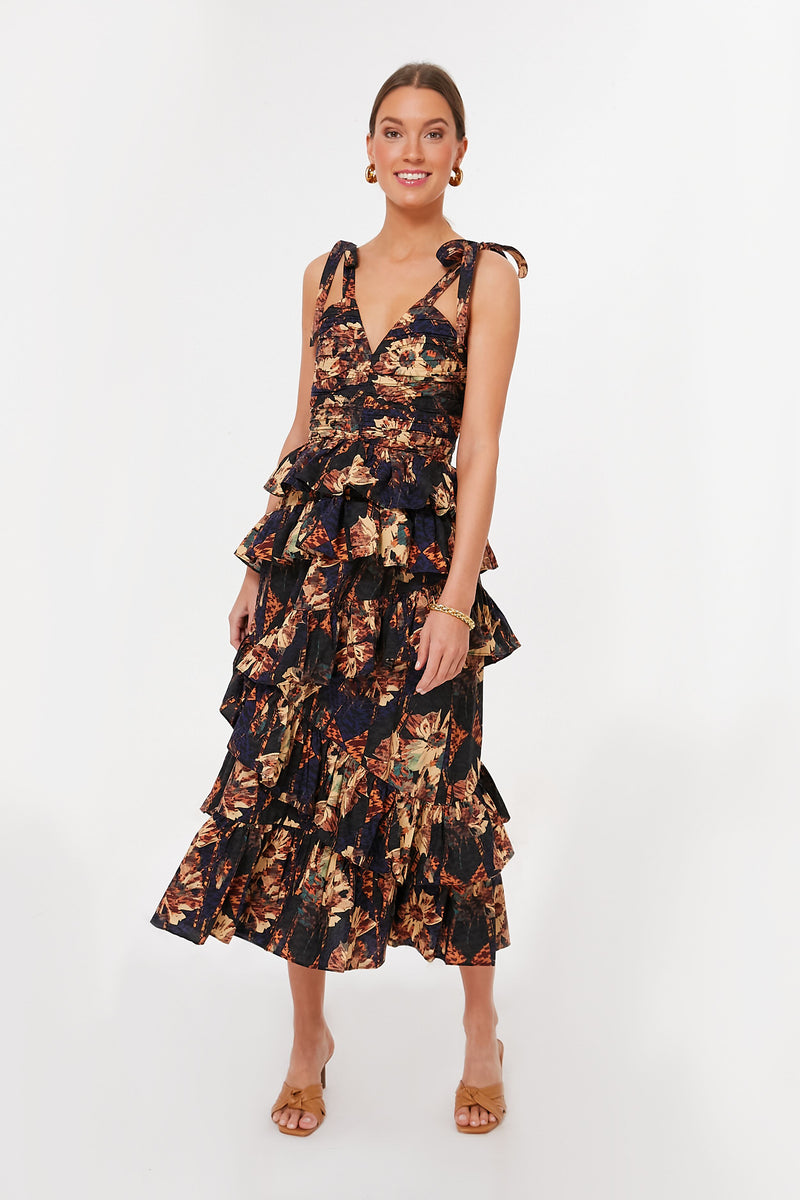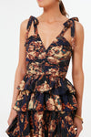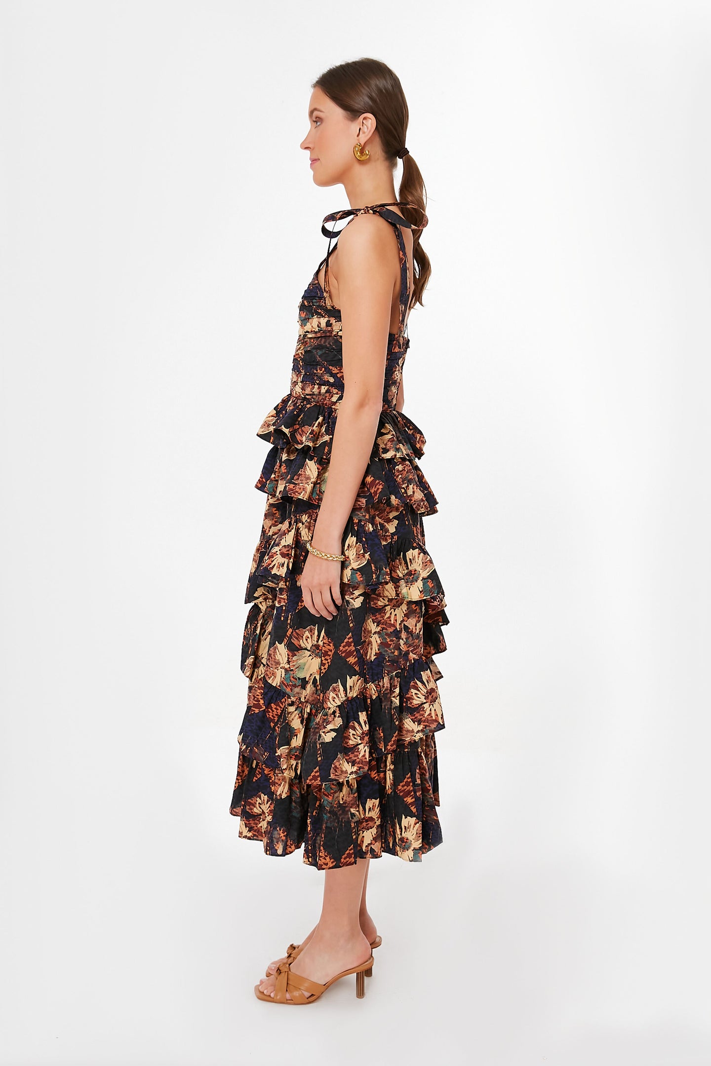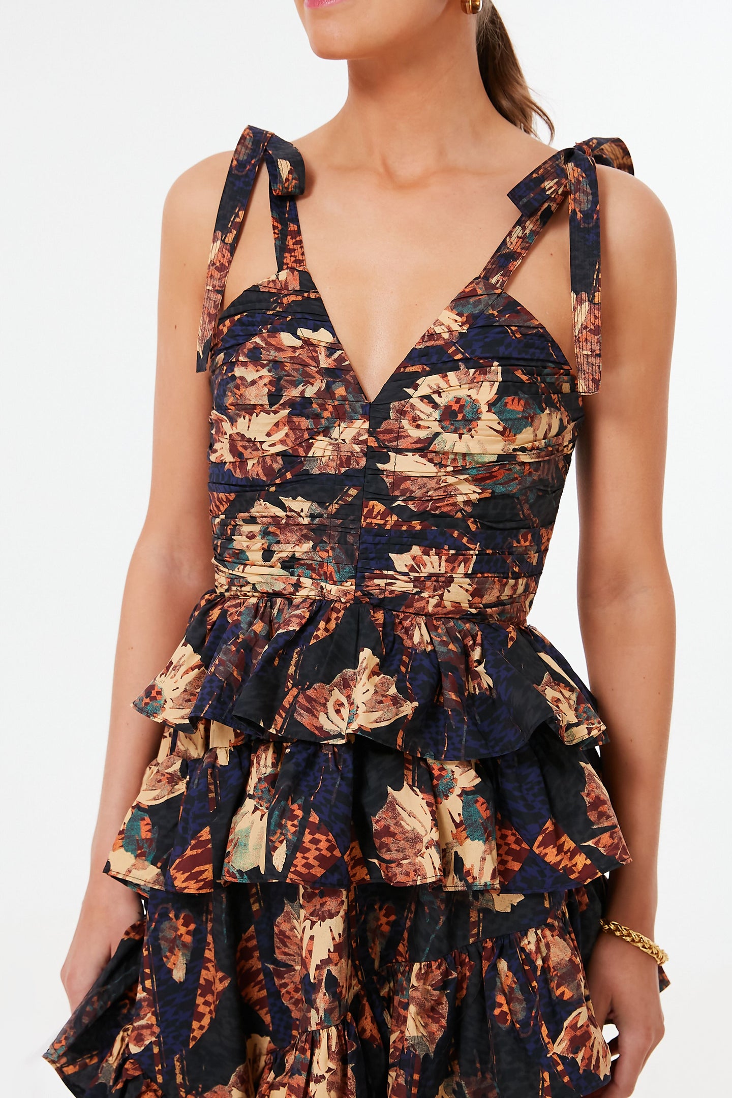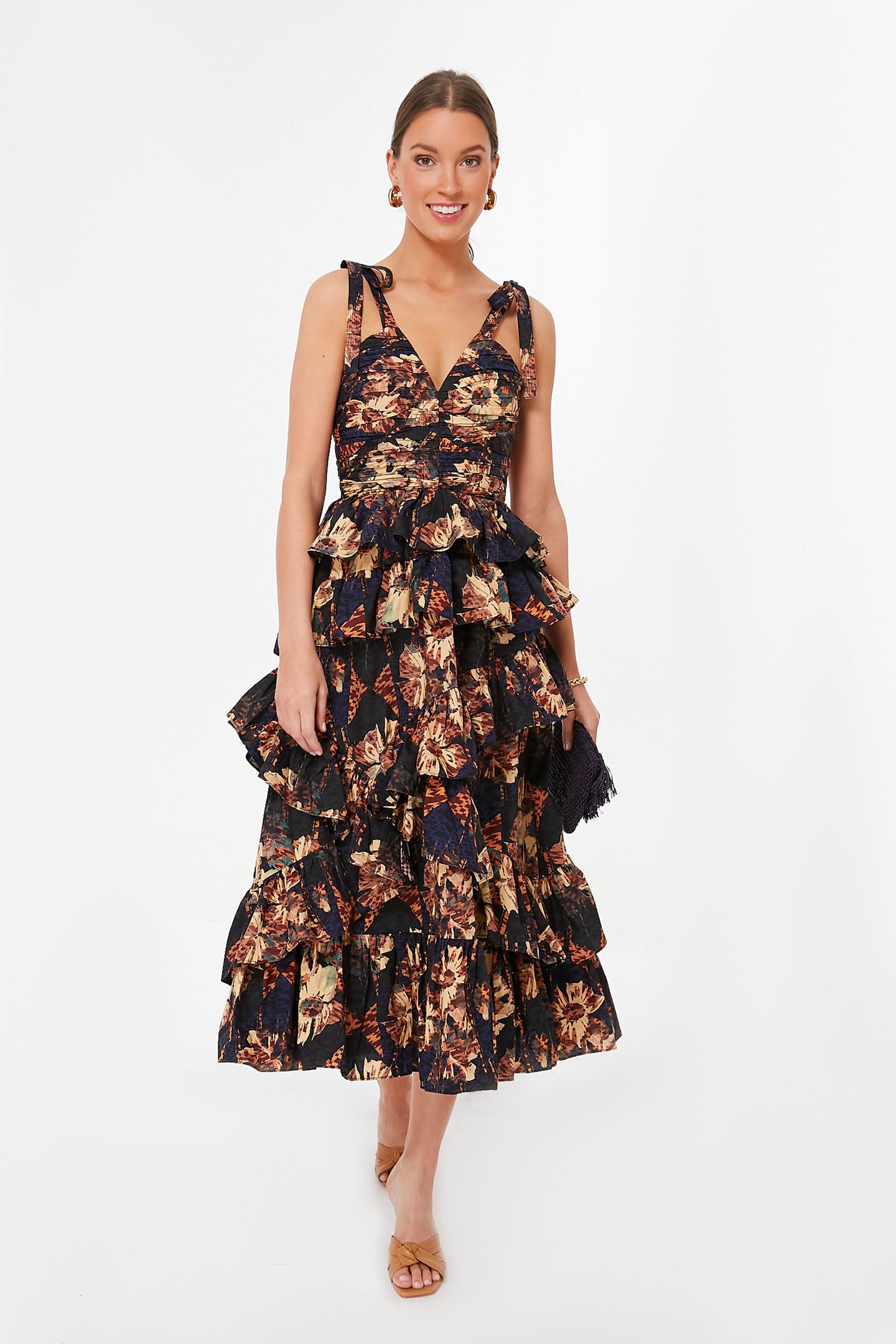 The Lupine Candace Dress is cut from hypnotic printed poplin that features a spliced flower print layered over a graphic diamond background. With a fitted ruched bodice designed with a deep V-neck, bowed shoulder ties, and a midi-length asymmetrical ruffled skirt, you'll want to twirl all night long with this number. Add sandals and fun earrings for a glamorous vacation look as you eat dinner and gaze at the stars.