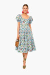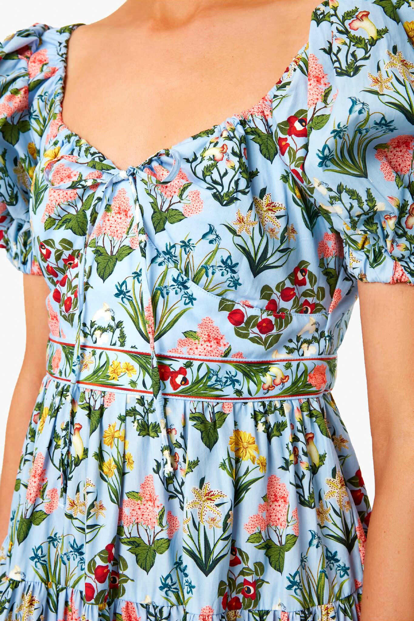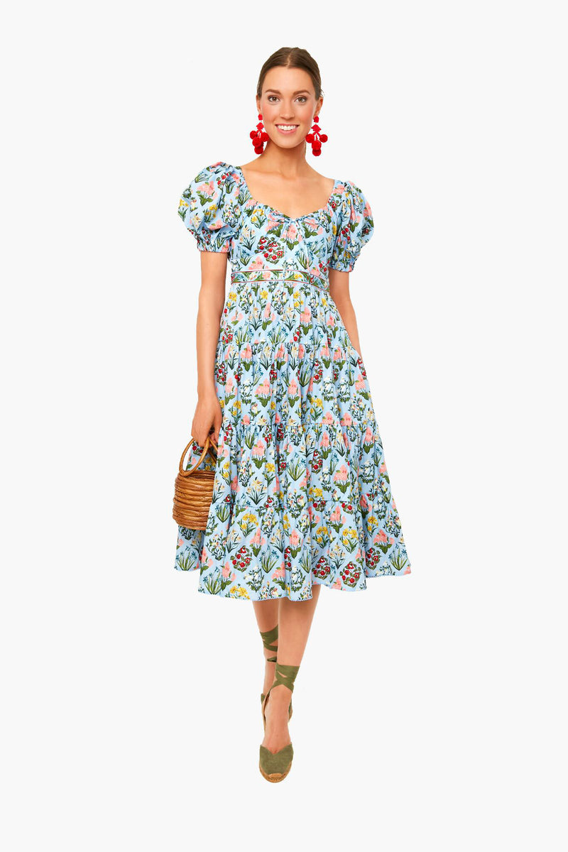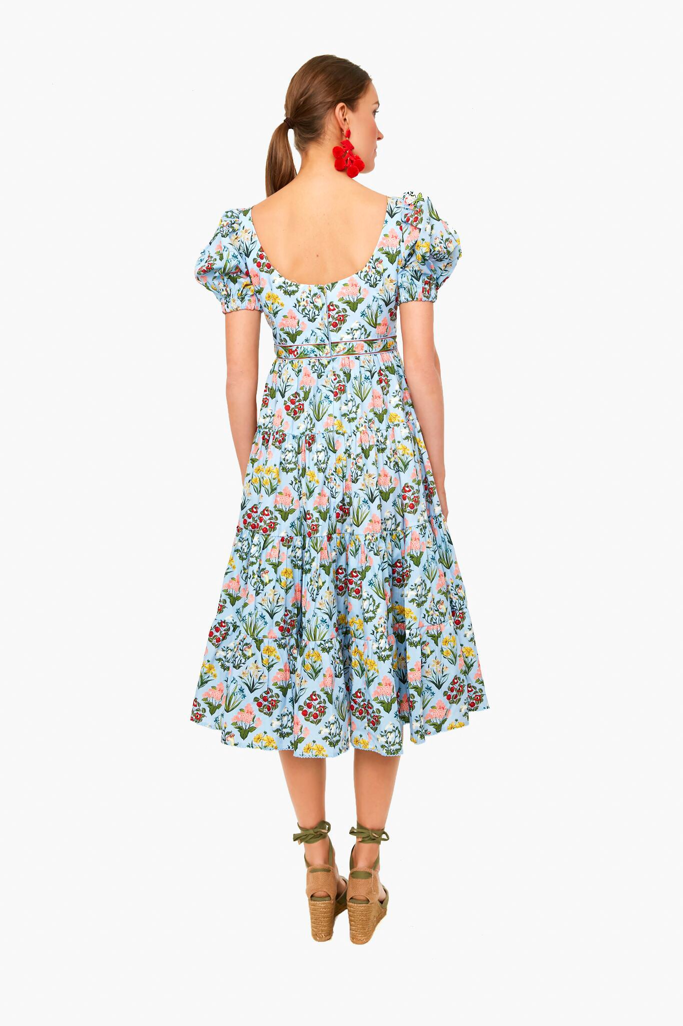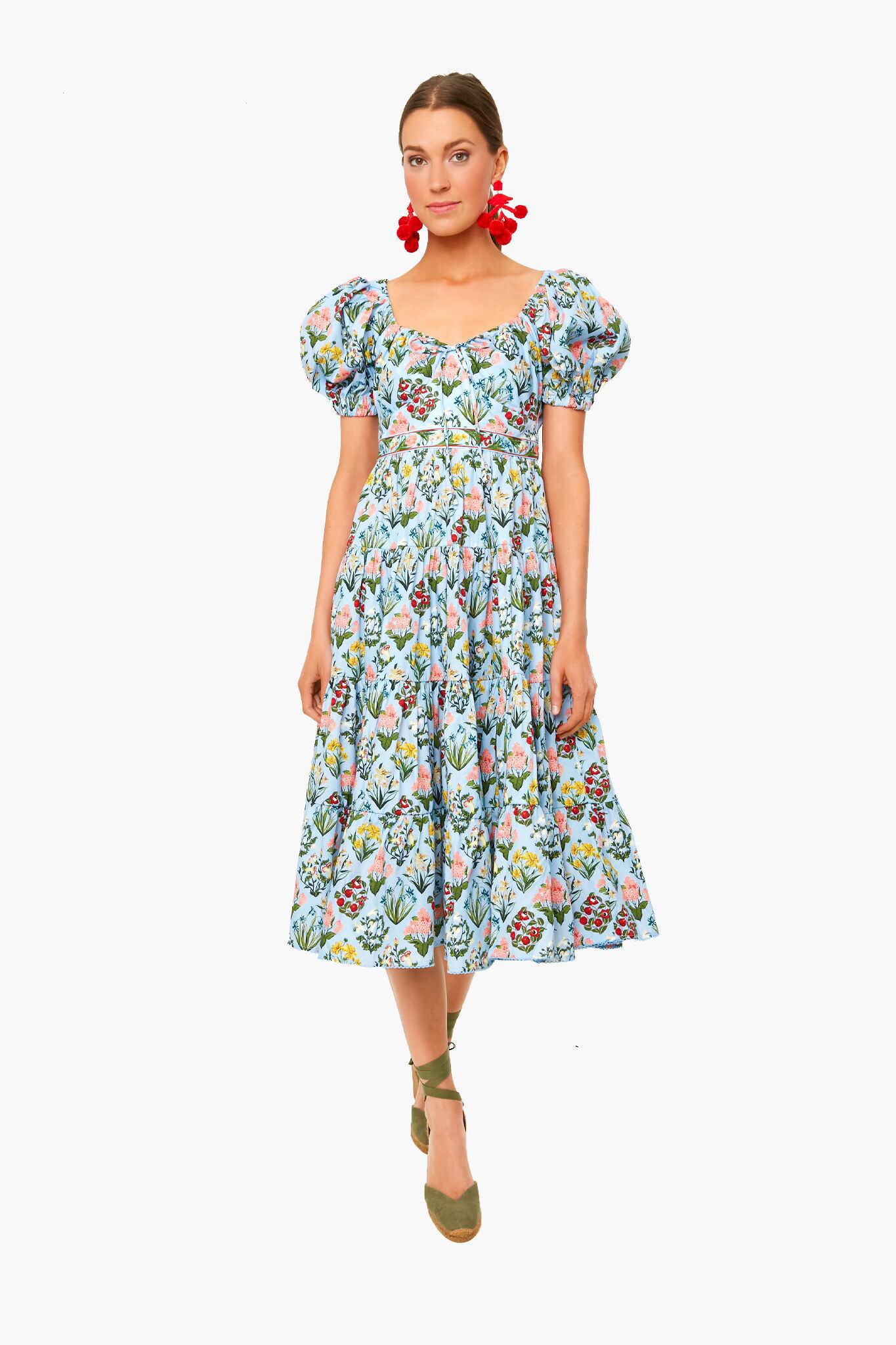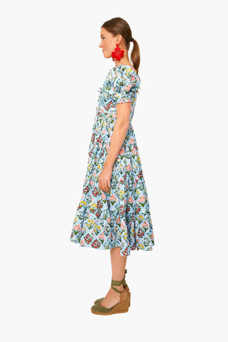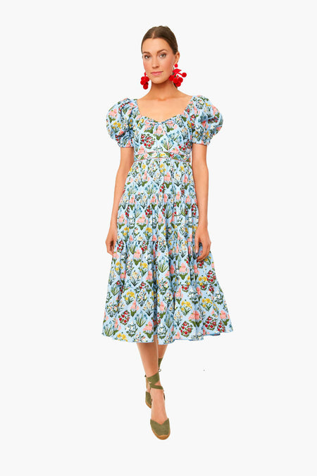 The Magdalena Dia Palmera Dress is made from crisp cotton printed with lush peonies, tulips, and lilies. Featuring a feminine silhouette with a cinchable sweetheart neckline, gently puffed sleeves, and a full tiered skirt that moves gracefully, this style has notes of magical realism. Dress it down for day with white sneakers or dress up for a party with gold heels and jewelry.