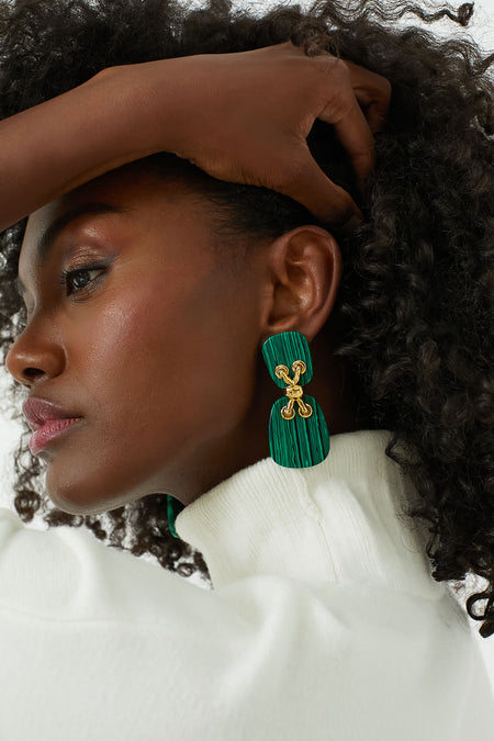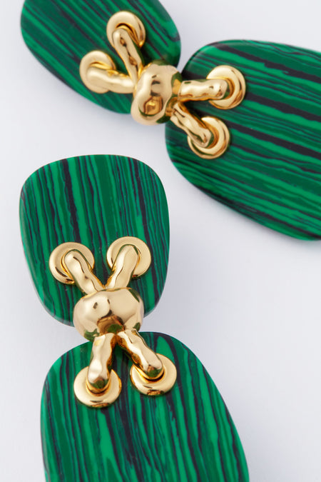 The Malachite Townes Earrings bring an unexpected twist to any look. These unique earrings combine richly hued malachite with hammered gold-plated brass. Top off your cocktail attire in style and prepare for endless compliments!