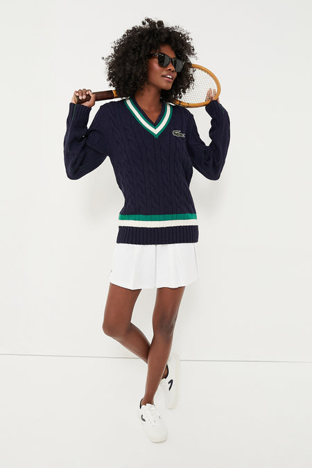 A new take on the essential style, the Marine Classic Cable Knit Tennis Sweater is timeless, versatile, and effortlessly cool. Featuring a chic V-neckline, striped trim, and doubled-up crocodile logos, there is nothing not to love about this classic look. Throw it over your tennis whites for a quick drink after your match, or style it with vintage denim for a unique look that's sure to earn you some compliments.
