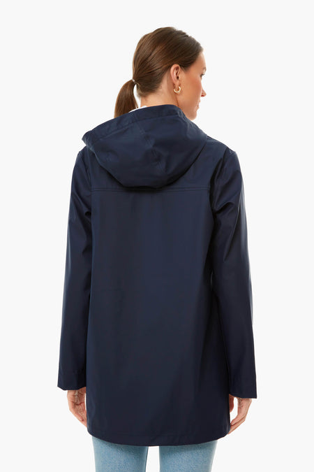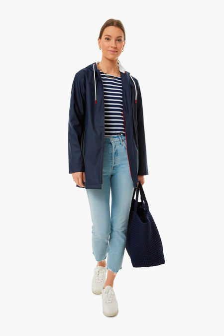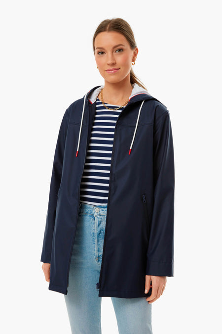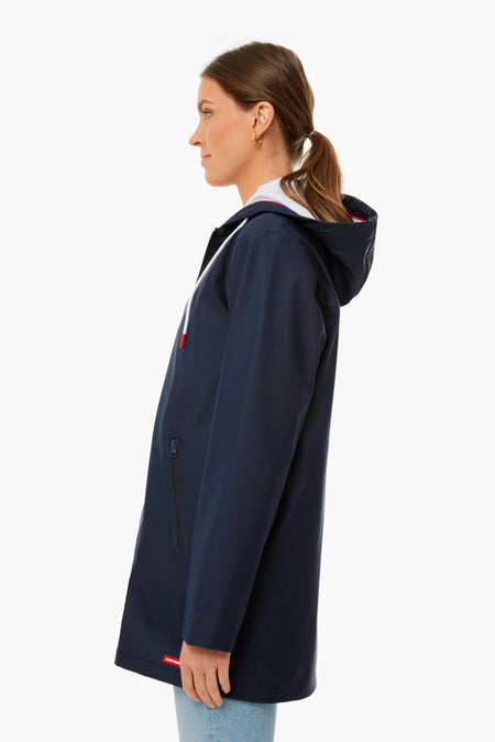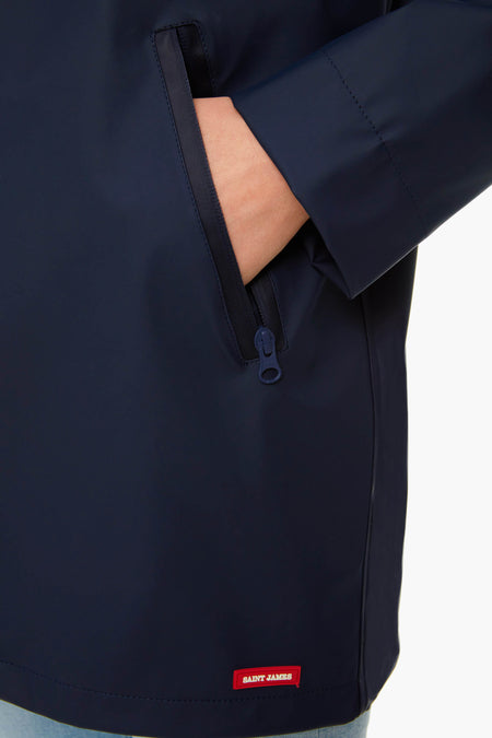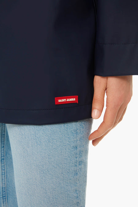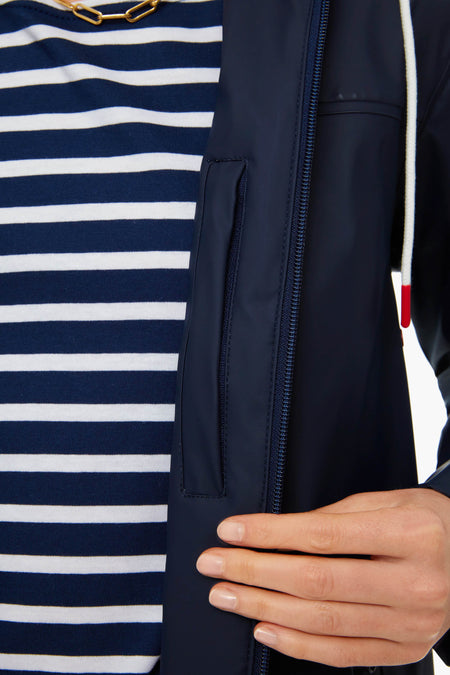 The Marine Ste Emma is a traditional staple of the nautical wardrobe tested season after season on the Normandy shore with its unpredictable weather. This raincoat combines a waterproof fabric with welded seams for maximum weather protection. Ventilated to prevent overheating, this long silhouette features an adjustable drawstring hood, as well as two comfortably slanted front zip pockets, a front zip closure, and a striped cotton lining. Waterproof, windproof and breathable, youâll want to wear this to find the fun even when itâs pouring!