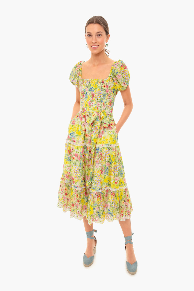 The Masie Dress is made from a wild flower garden print on a breezy cotton fabric. This style features a square neckline, smocked bodice, short puff sleeves, eyelet embroidery, scalloped lace trim, and a self-tie belt. Pair with wedges and a wicker tote for a look that is pure sunshine!
