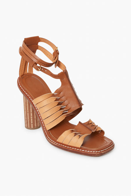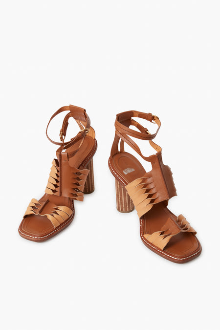 As featured in the SS22 runway show, the Meerkat Madeira Heel is cut in smooth calfskin with twisted slits of leather exposing a hint of contrast, set on a striped, cylindrical cork heel. Featuring a leather footbed, stitching along the base, and a double ankle tie with antique brass detailing, these are a unique and special style. Pair back to day dresses or denim and a chic top for date nights and spring events.
