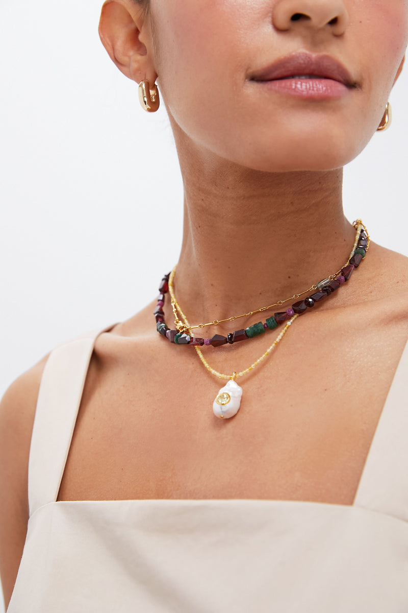 The Midnight Athena Necklace will make holiday accessorizing a snap. Featuring gold-plated brass chain, yellow opal, garnet, ruby, green aventurine, and quartz beads, and a luminous freshwater pearl charm inlaid with semiprecious lemon quartz. This opulent multi-strand pairs well with coastal maxis and espadrilles for days sent by the sea or for when you need to add a little flair to your look.