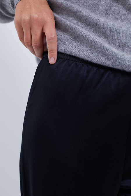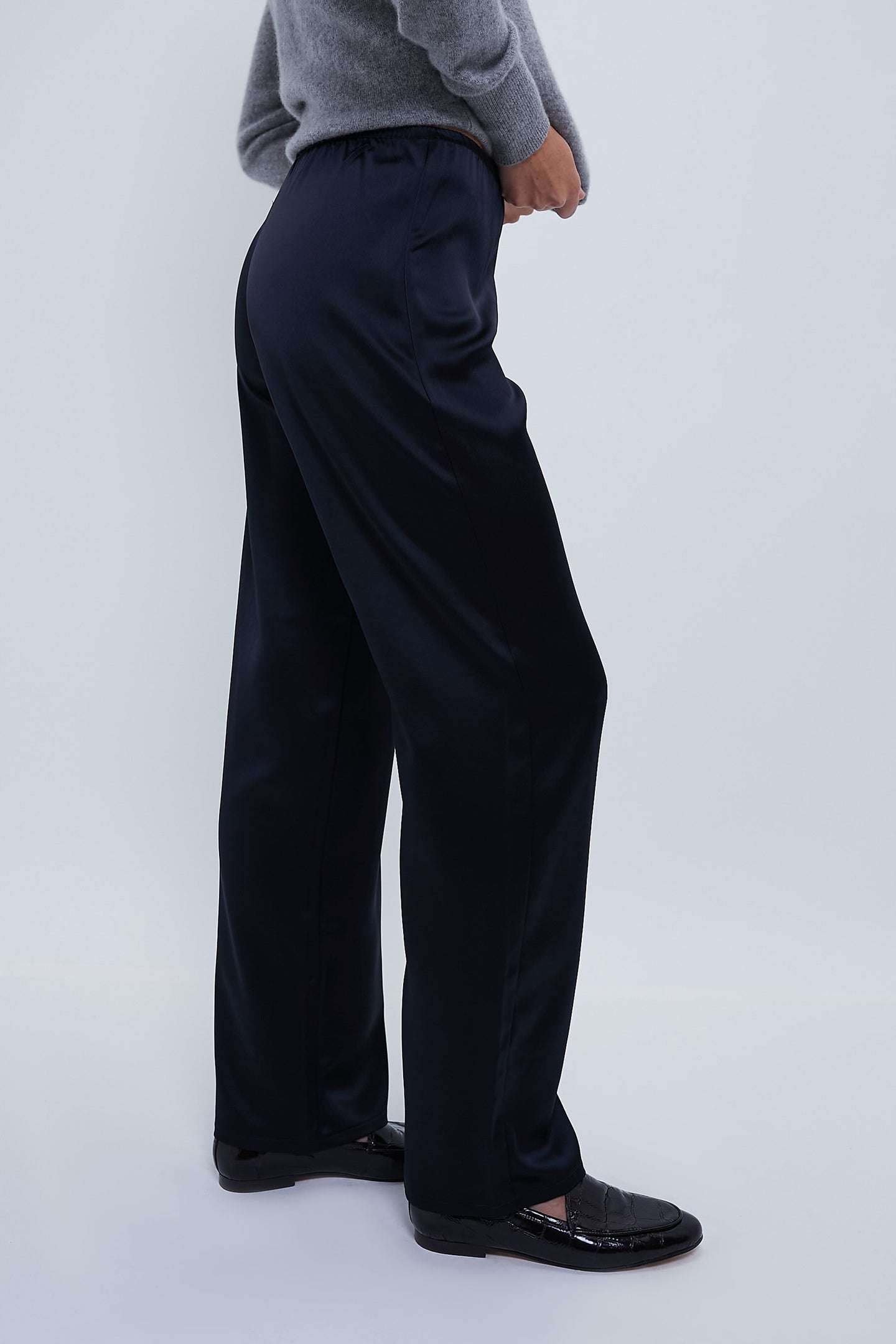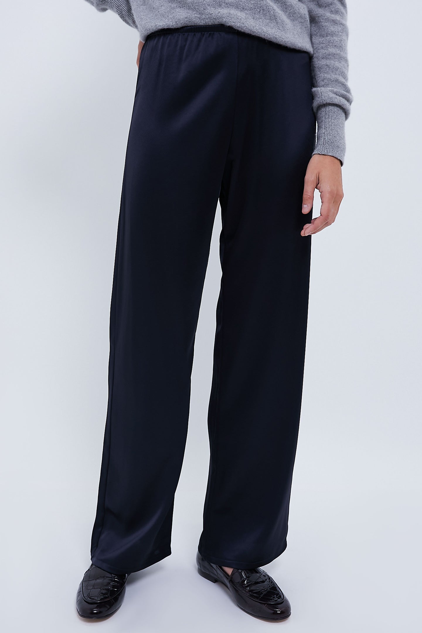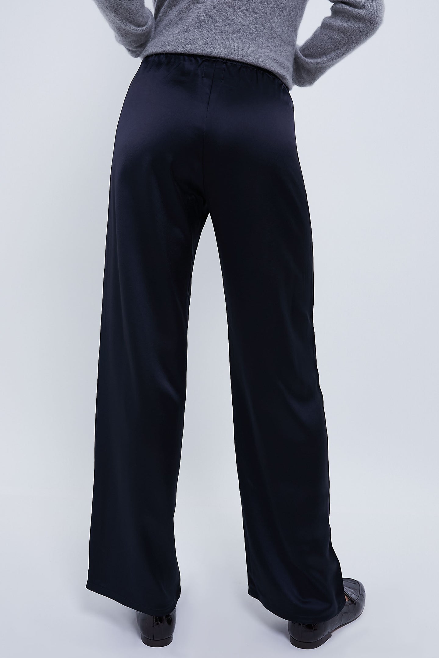 Cozy chic has never looked as good as the Midnight Barb Wide Leg Pants. Cut in a Japanese-crafted satin, this easy pull-on silhouette features a thin elastic mid-rise waistband and a relaxed, perfectly draped wide leg. We pair this with a basic pull over or a tee for everyday elegance.