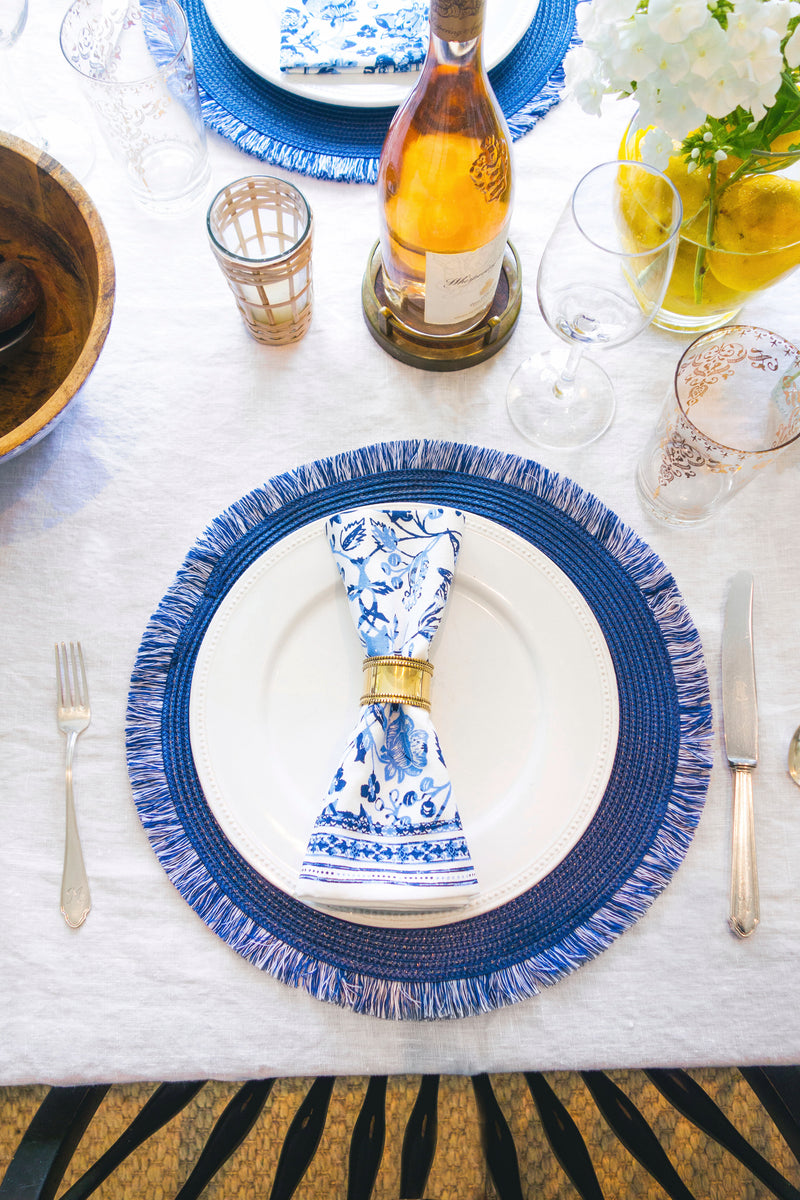Energized by rich texture, the Midnight Blue Round Fringed Placemats beg to be layered with chic patterns and color. They will be a fun addition to your nightly family meal or holiday tablescape.
