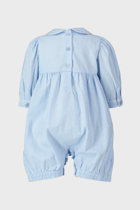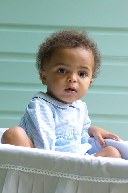 This beautiful Mini Check Babysuit boast of simplicity and elegance. It features a classic pale blue check pattern with ivory piping details. The peter pan collar and gathered body with back and inner leg button opening make it both stylish and convenient for your little one, making it perfect for everyday or formal gatherings!